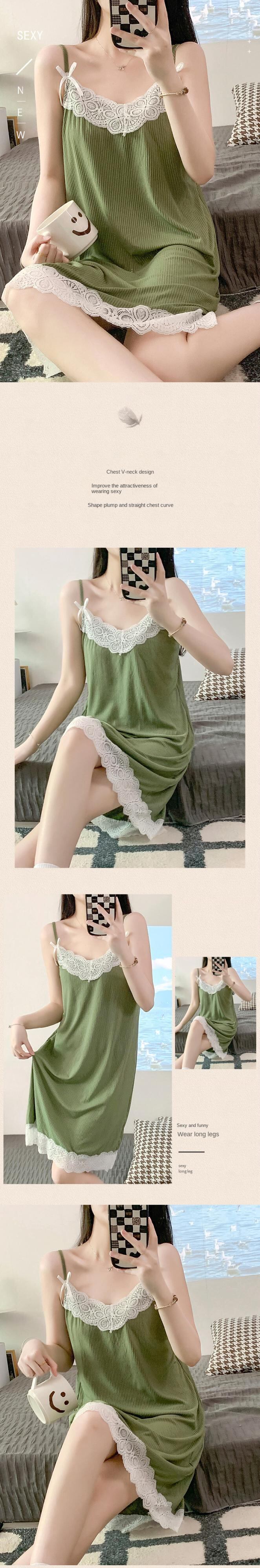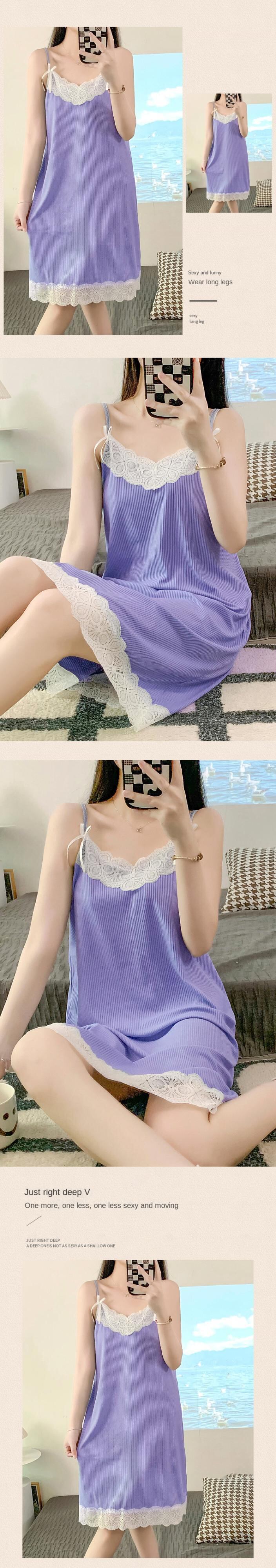夏寝間着ポリエステルクレープスリングロングスカートファッション薄いノースリーブルーズミッドレングスセクシーレースホームドレス サマー 夏物