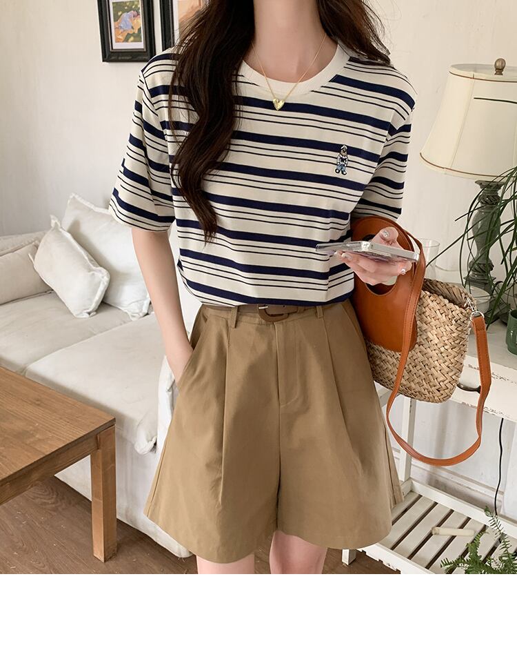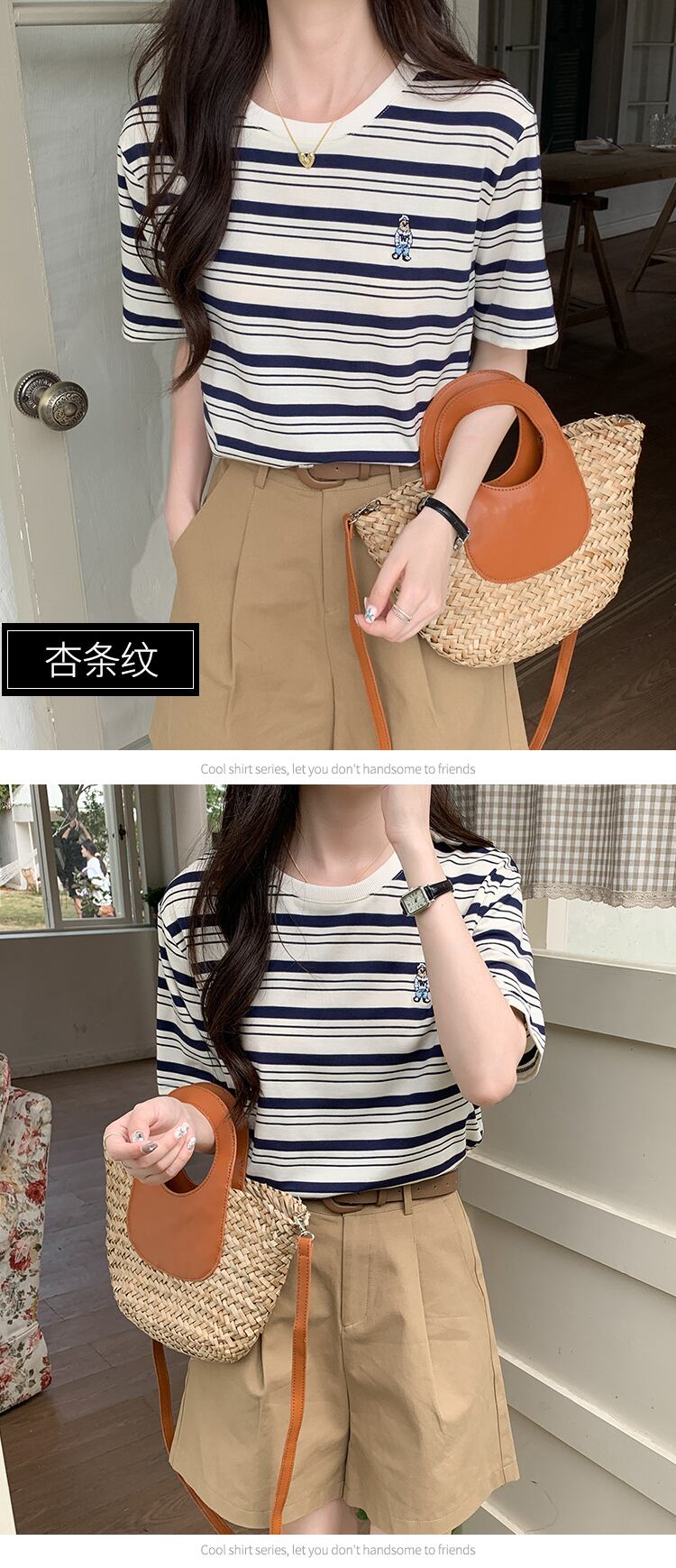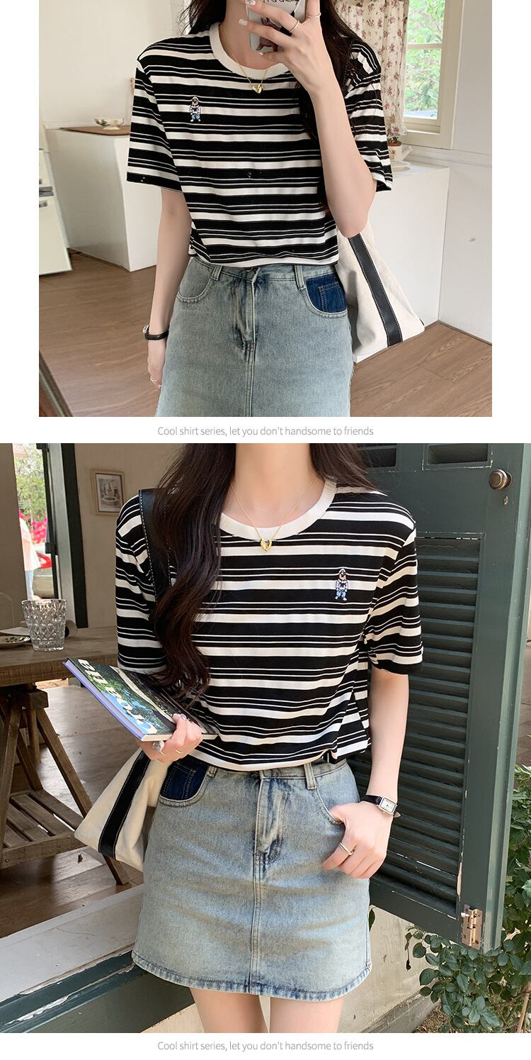 韓国ストライプ漫画刺繍 tシャツ夏純粋綿 Tシャツ原宿グラフィック因果ルーズ tシャツ黒 y2k トップス ブラック コットン かわいい サマー 夏物 ピュア