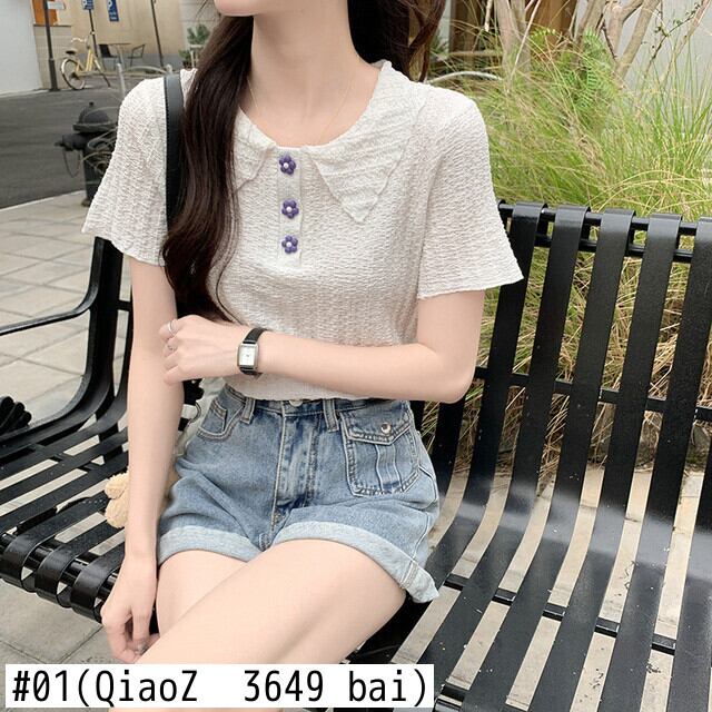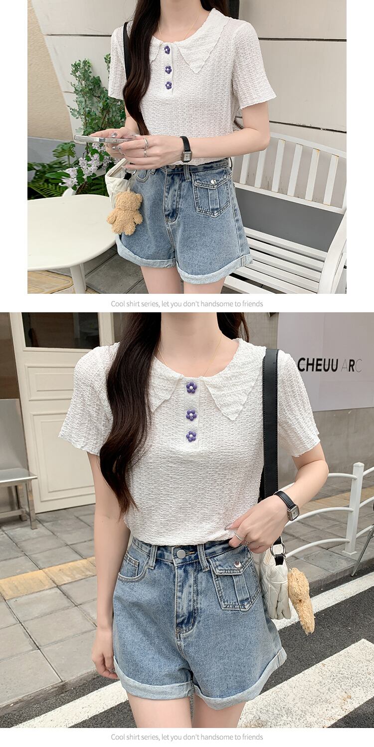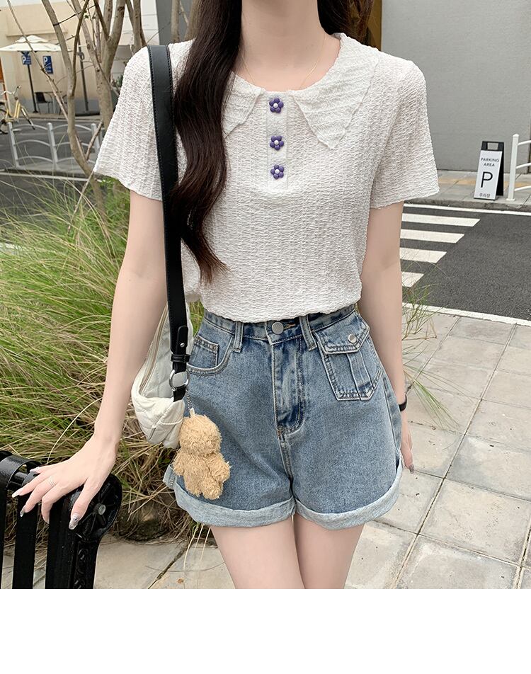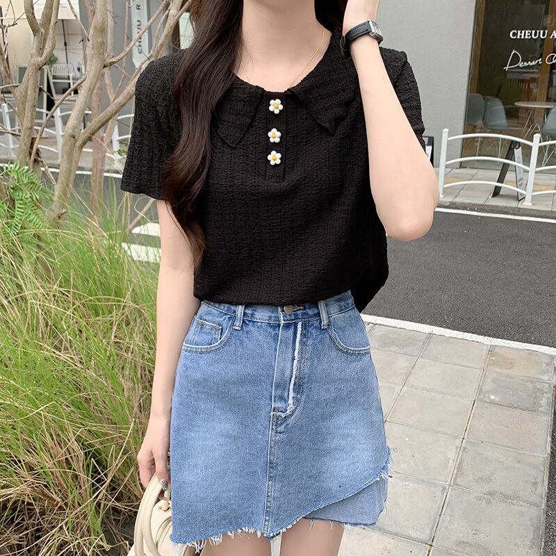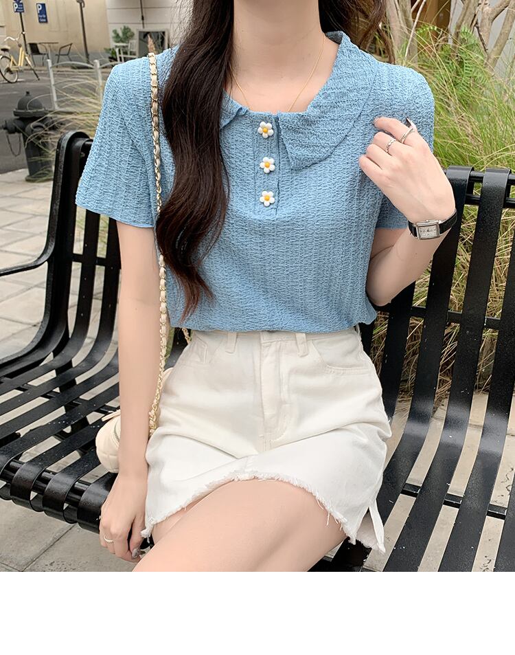 夏花ボタン Tシャツ韓国ブルー底入れベーシック tシャツ若い半袖スリムクロップトップス tシャツ ショート ハーフスリーブ サマー 夏物 ソリッドカラー フラワーデザイン