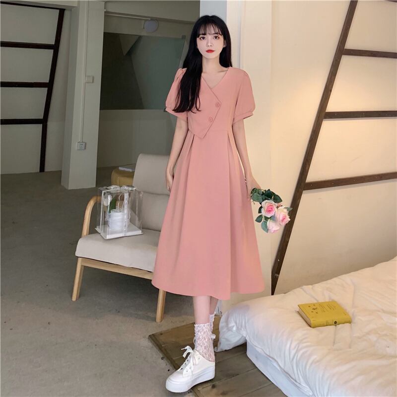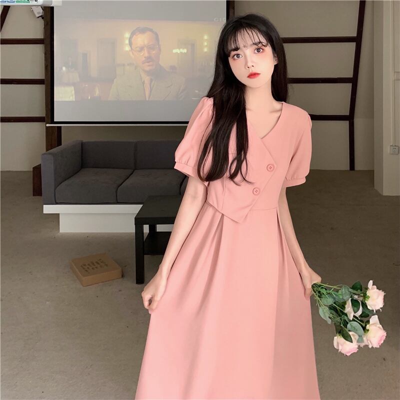 V ネックマキシドレス韓国スタイル A ラインドレス半袖パーティー夏ピンク黒ボディコンドレス ショート ブラック ハーフスリーブ サマー 夏物 Vネック Aライン ソリッドカラー
