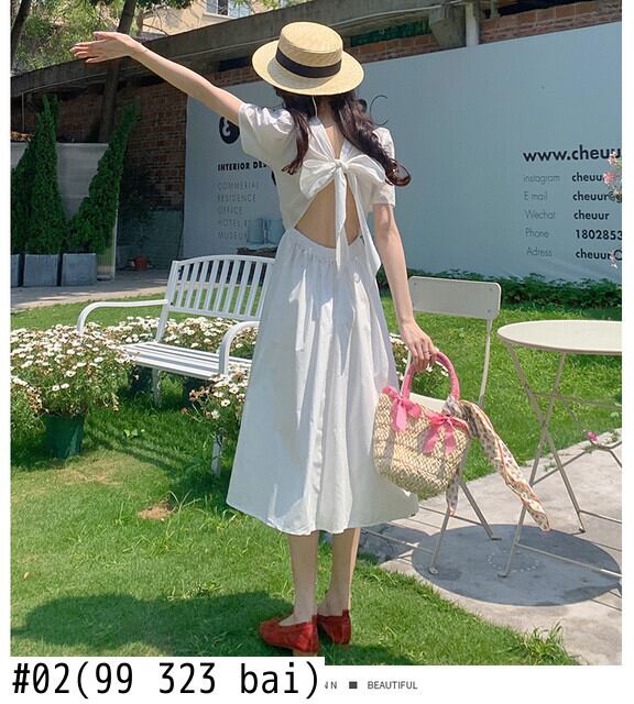 夏ミッドレングス弾性ウエスト A ラインドレス韓国ボディコンドレスバックくり抜き V ネック若者ガールドレス エラスティック 伸縮 サマー 夏物 Vネック Aライン