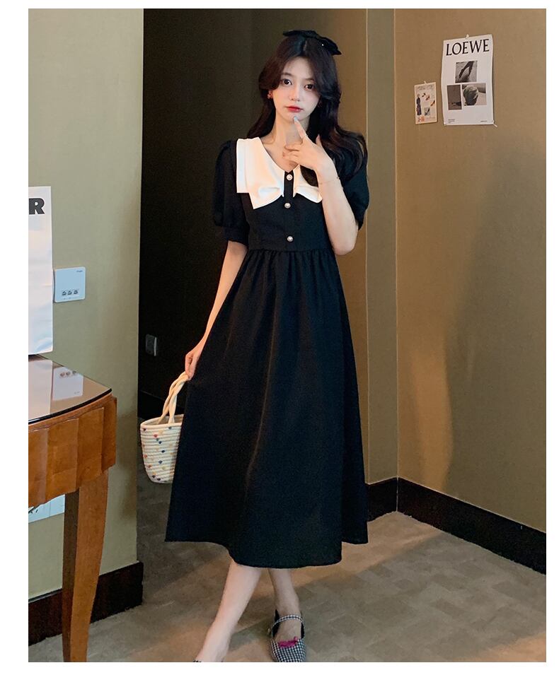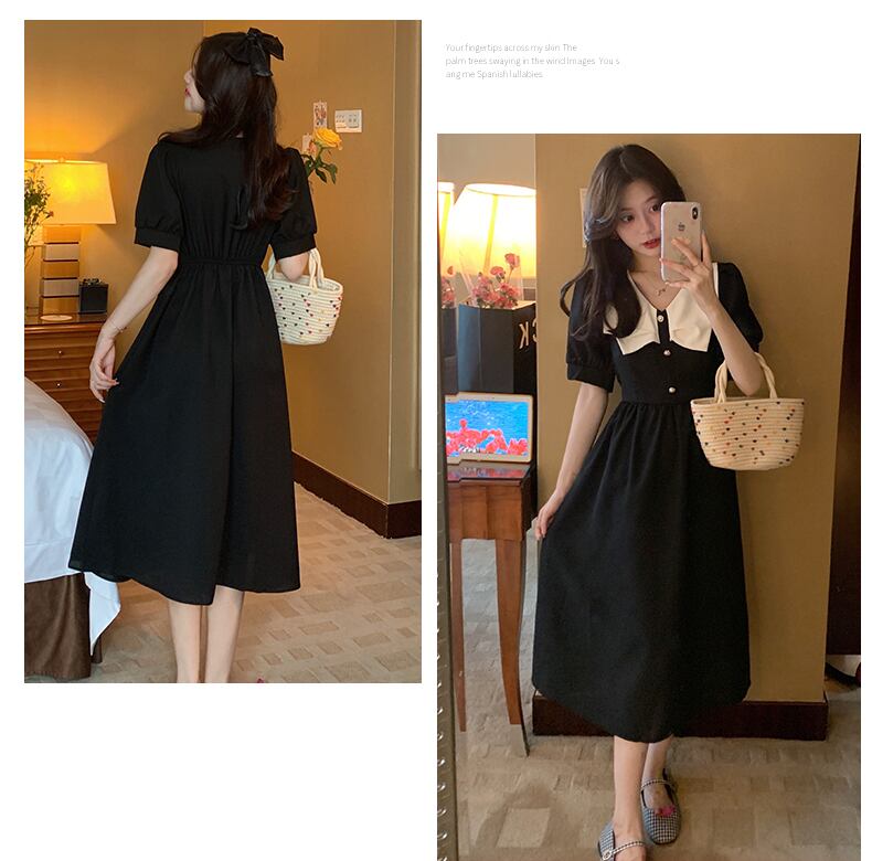 夏カラーブロックルーズロングスカート年齢軽減ドレスフレンチスタイル甘い V ネック黒ボディコンドレス ブラック 大人ガーリー スウィート キュート カジュアル サマー 夏物 Vネック