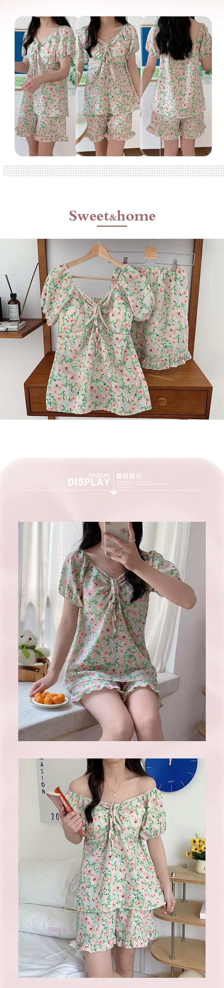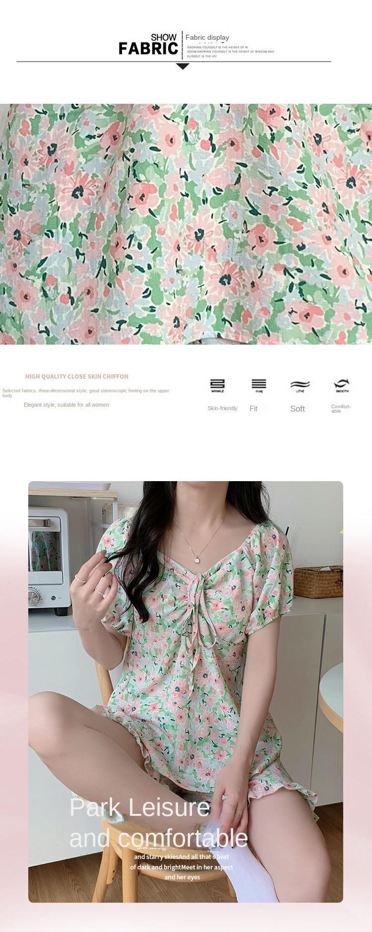 夏甘い花パジャマ織クリンクル布 V ネック肩 2 着用ダブルショート胸パッド睡眠ホームウェアセット 大人ガーリー スウィート キュート カジュアル サマー 夏物 Vネック フラワーデザイン