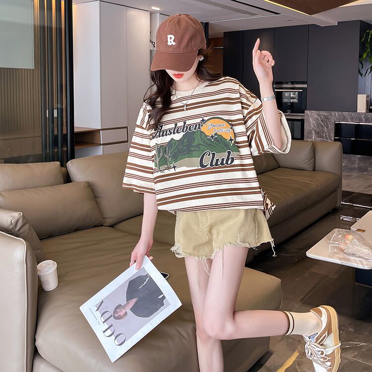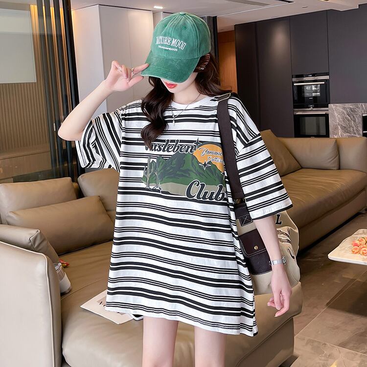 夏ロング Tシャツ原宿綿半袖 Tシャツストライプレタープリント Tシャツユニセックスカジュアル特大 y2k トップス ショート コットン ハーフスリーブ かわいい サマー 夏物
