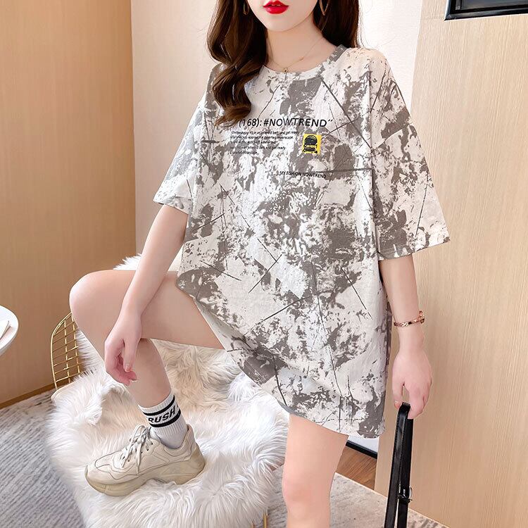 手紙絞り染めプリント Tシャツ O ネックロング特大 tシャツ綿ユニセックス y2k トップスレジャー半袖 tシャツ コットン ハーフスリーブ Oネック