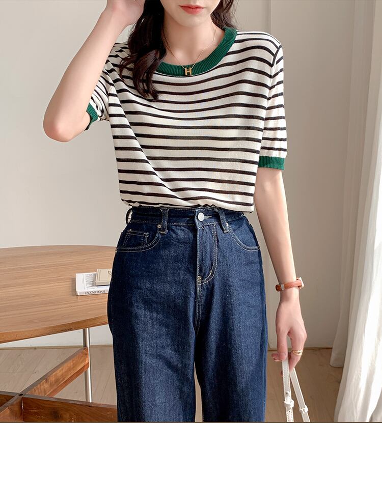 夏カラーステッチストライプニット Tシャツルーズ半袖ニットトップス韓国ファッショングラフィック Tシャツ ショート ハーフスリーブ サマー 夏物