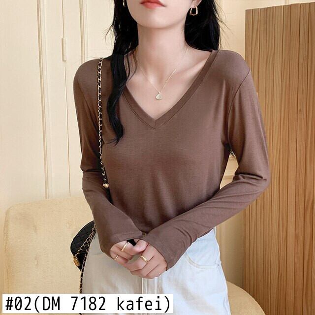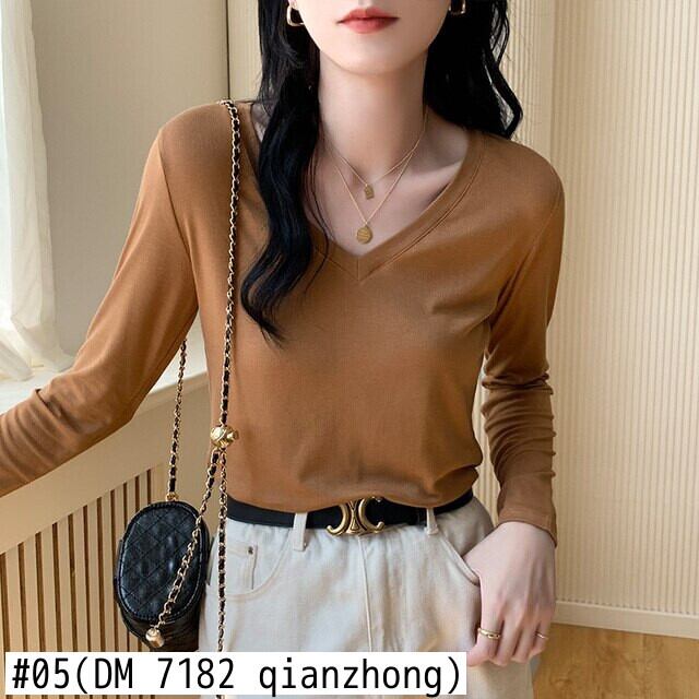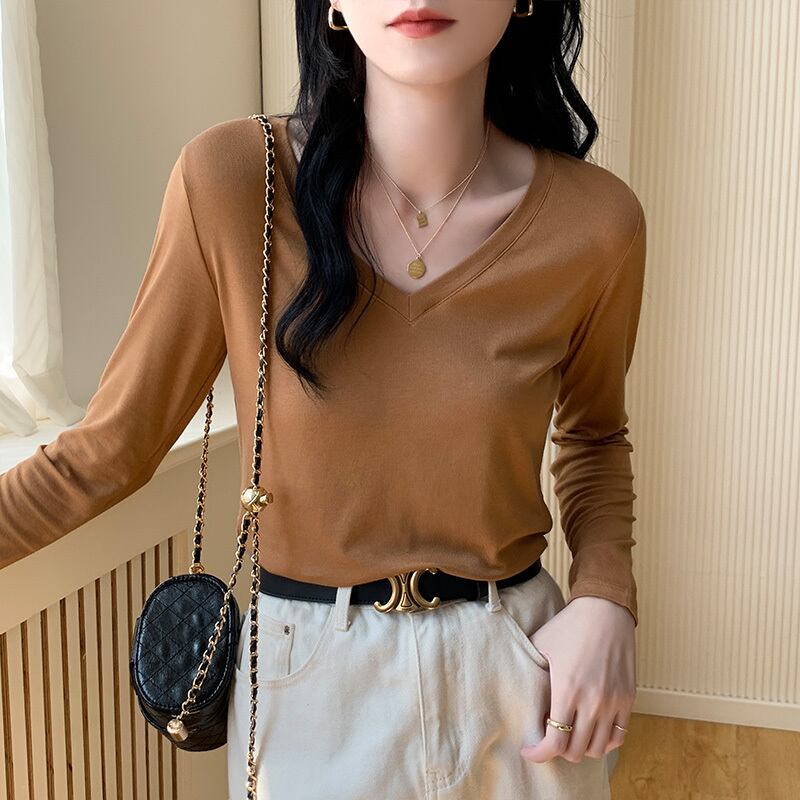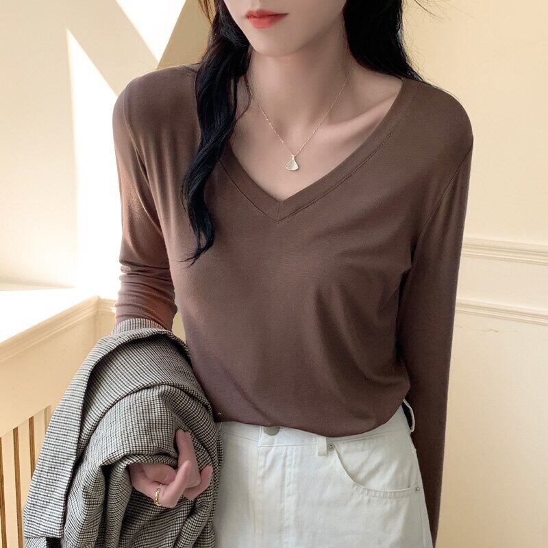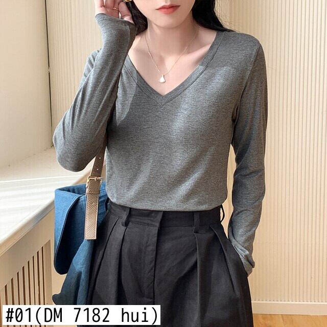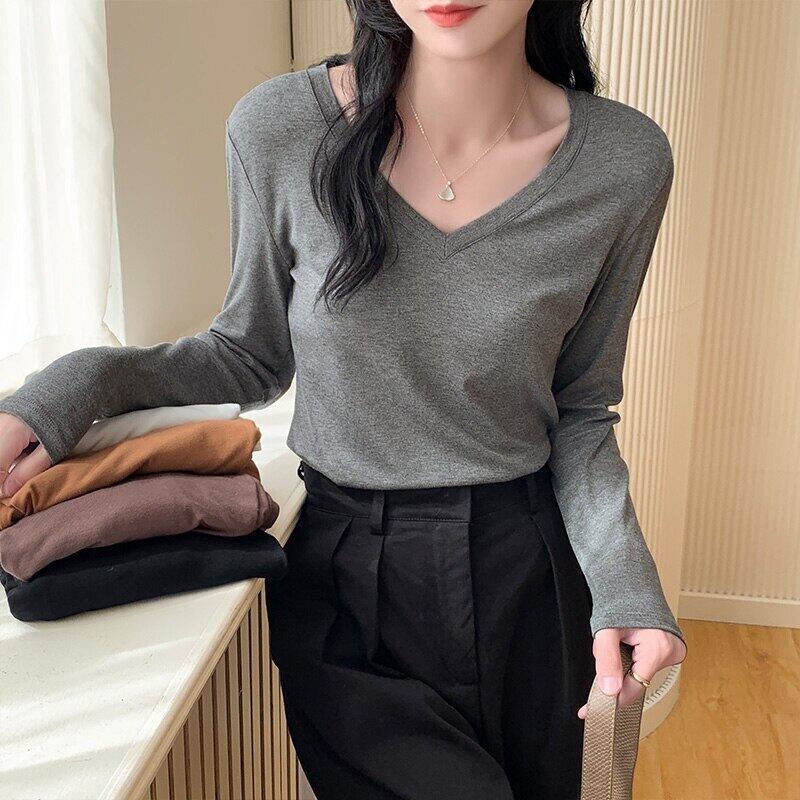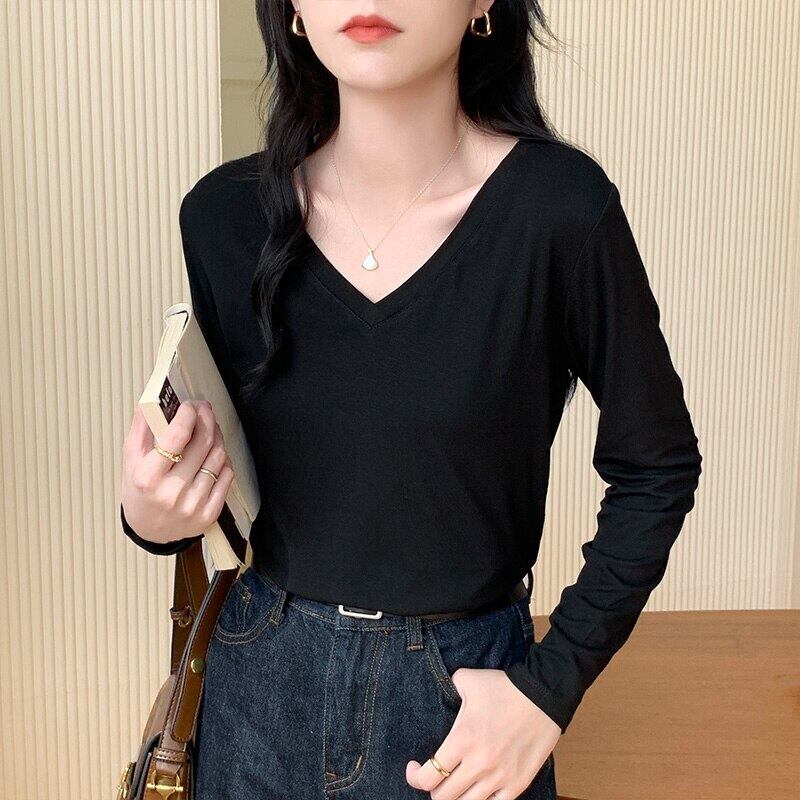 秋原宿綿ソフト底入れ tシャツ服 V ネックスリム長袖 Tシャツ白黒グレートップス ロング ホワイト ブラック コットン かわいい オータム 秋物 Vネック ソリッドカラー
