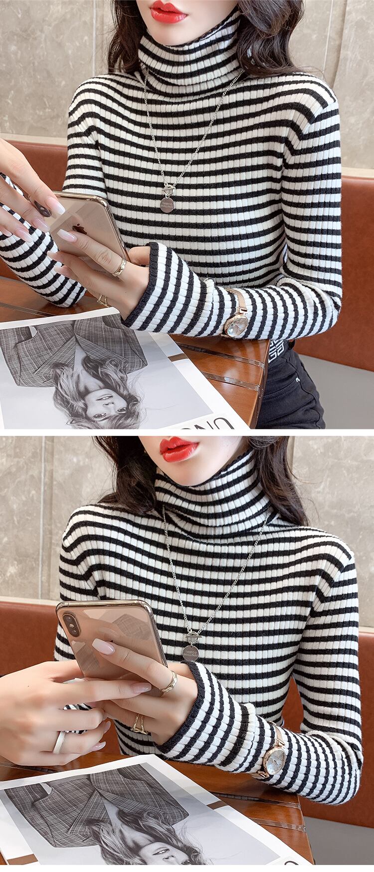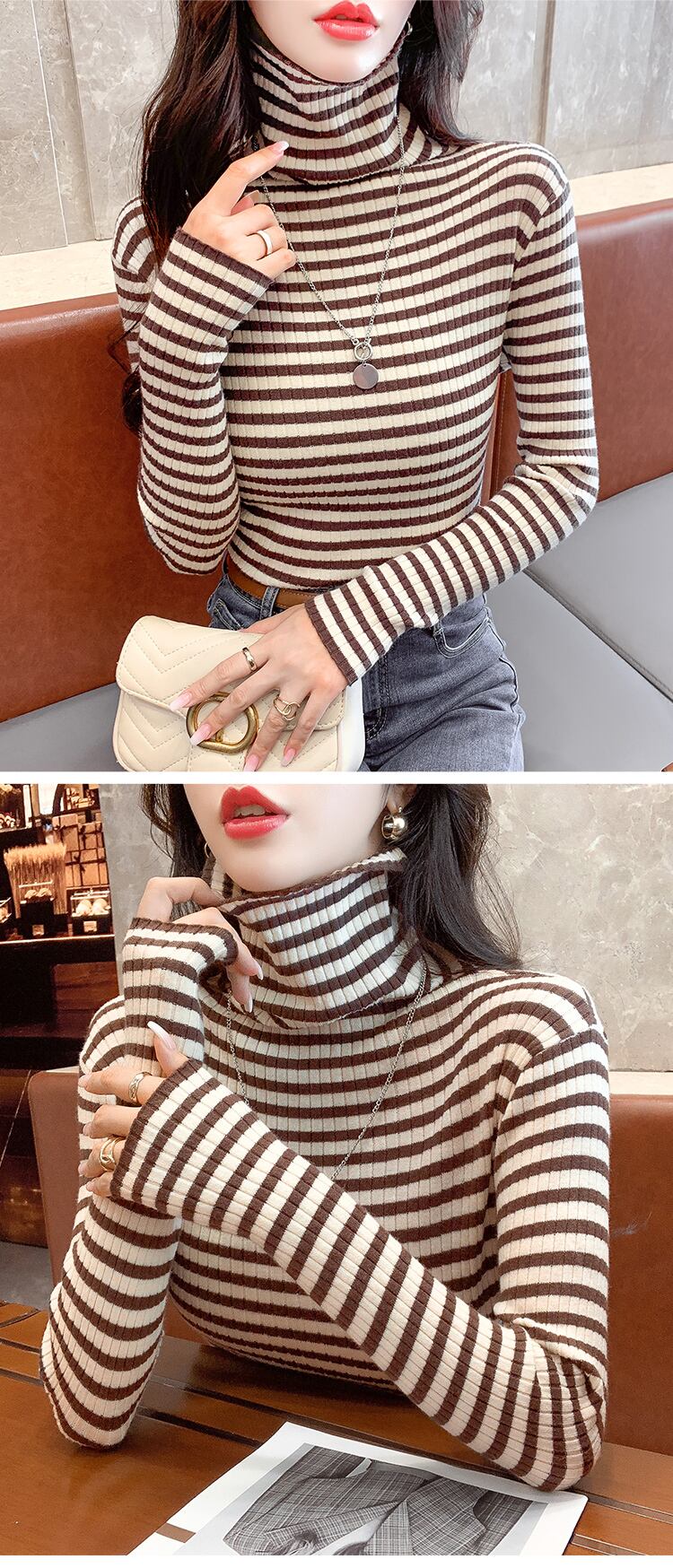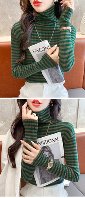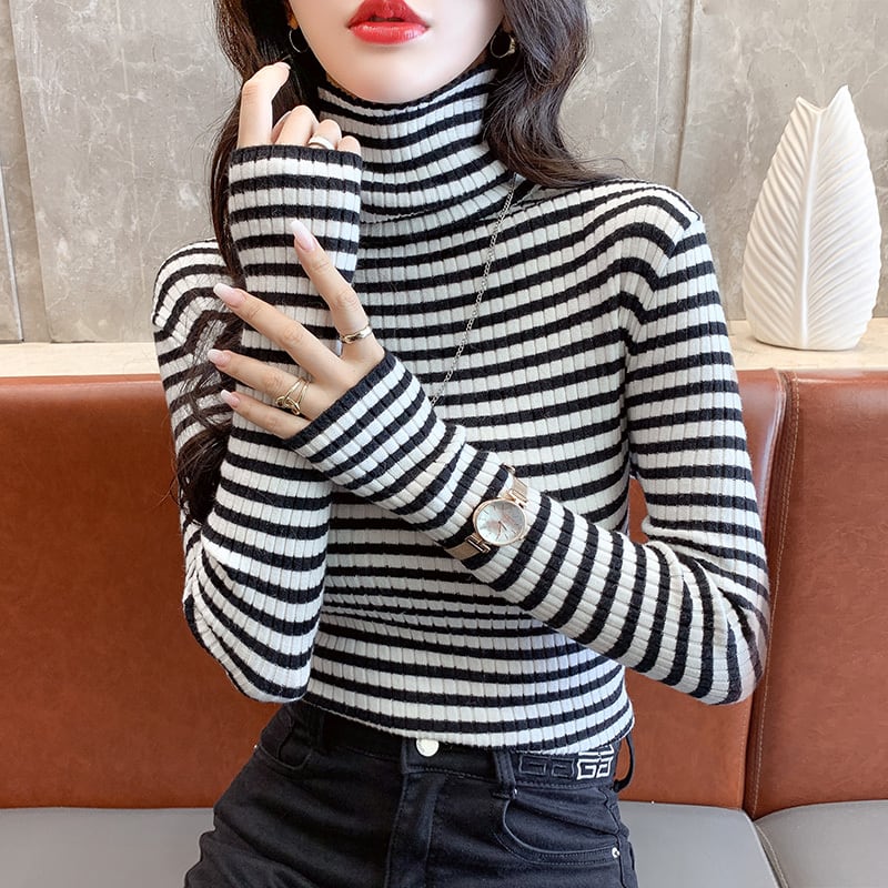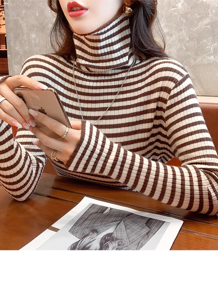 春秋ストライプニットセーター長袖プルオーバー韓国スリムタートルネックセーターボトリングセータートップス ロング スプリング 春物 オータム 秋物