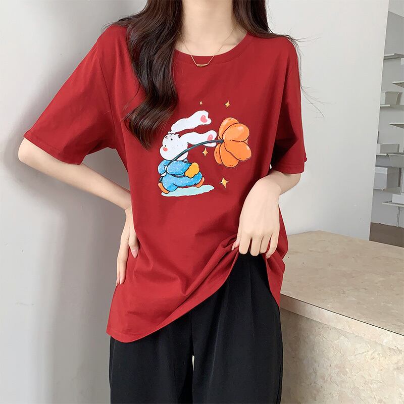 夏純粋綿かわいい漫画プリント Tシャツ原宿オールマッチ半袖 Tシャツ韓国ルーズ黒 y2k トップ ブラック コットン 大人ガーリー サマー 夏物 ピュア