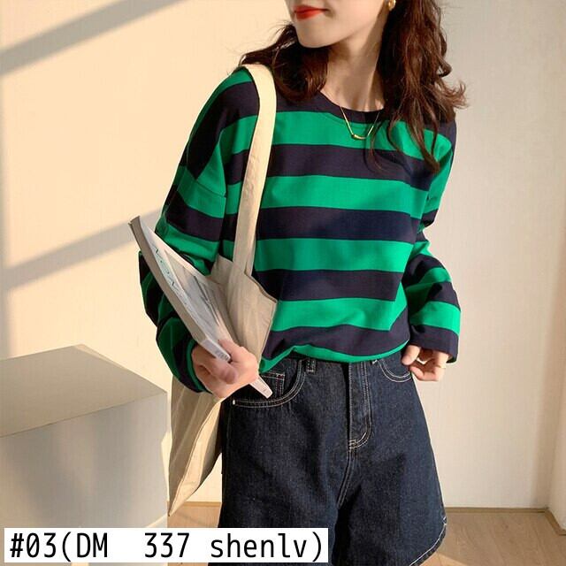春秋純粋綿長袖 Tシャツ O ネックストライプカジュアル特大 tシャツ韓国ボトムグリーン y2k トップス ロング コットン スプリング 春物 オータム 秋物 Oネック ピュア