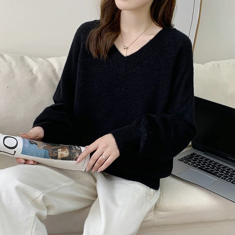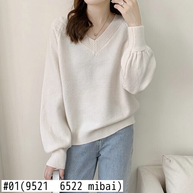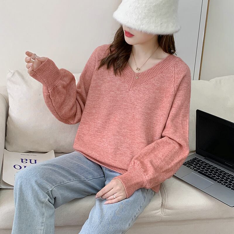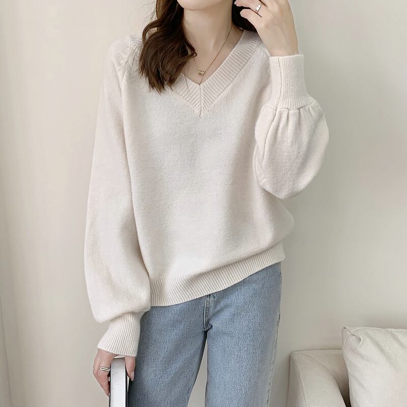 セーター春秋カジュアルルーズニットセーターアウター韓国 V ネックパフスリーブプルオーバー スプリング 春物 オータム 秋物 Vネック ソリッドカラー