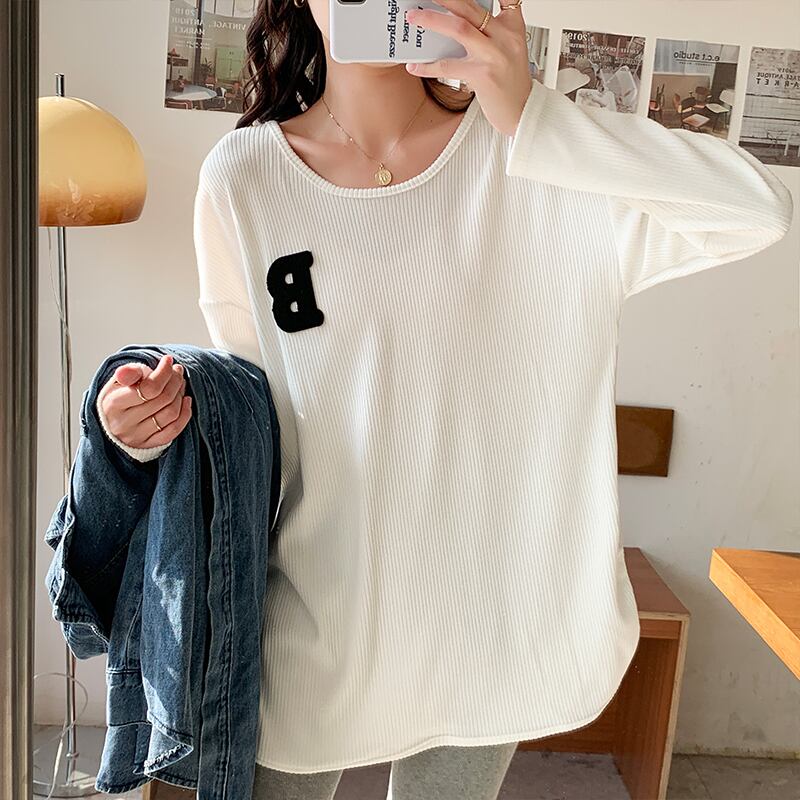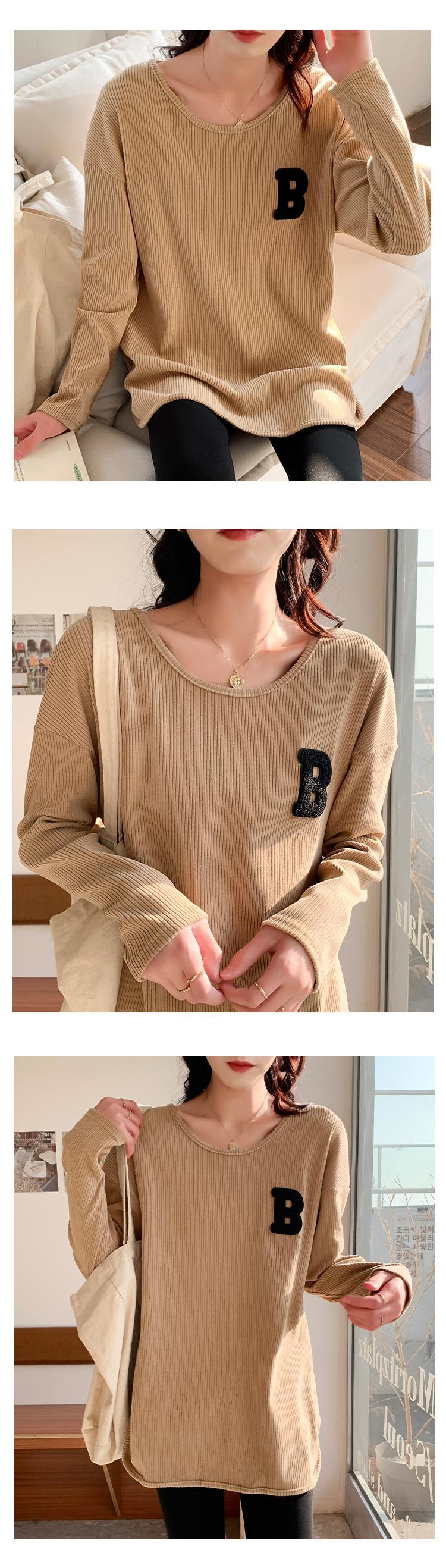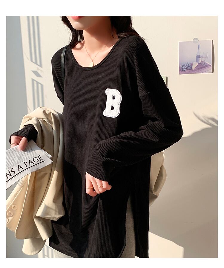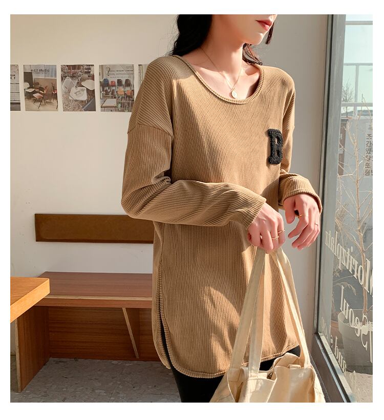 秋冬手紙刺繍コーデュロイ Tシャツファッション特大サイドスリット tシャツ長袖底 y2k トップス ロング オータム 秋物 ウィンター 冬物