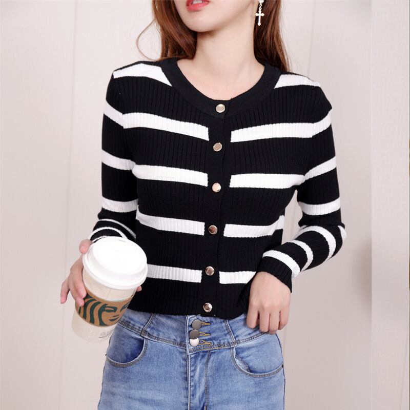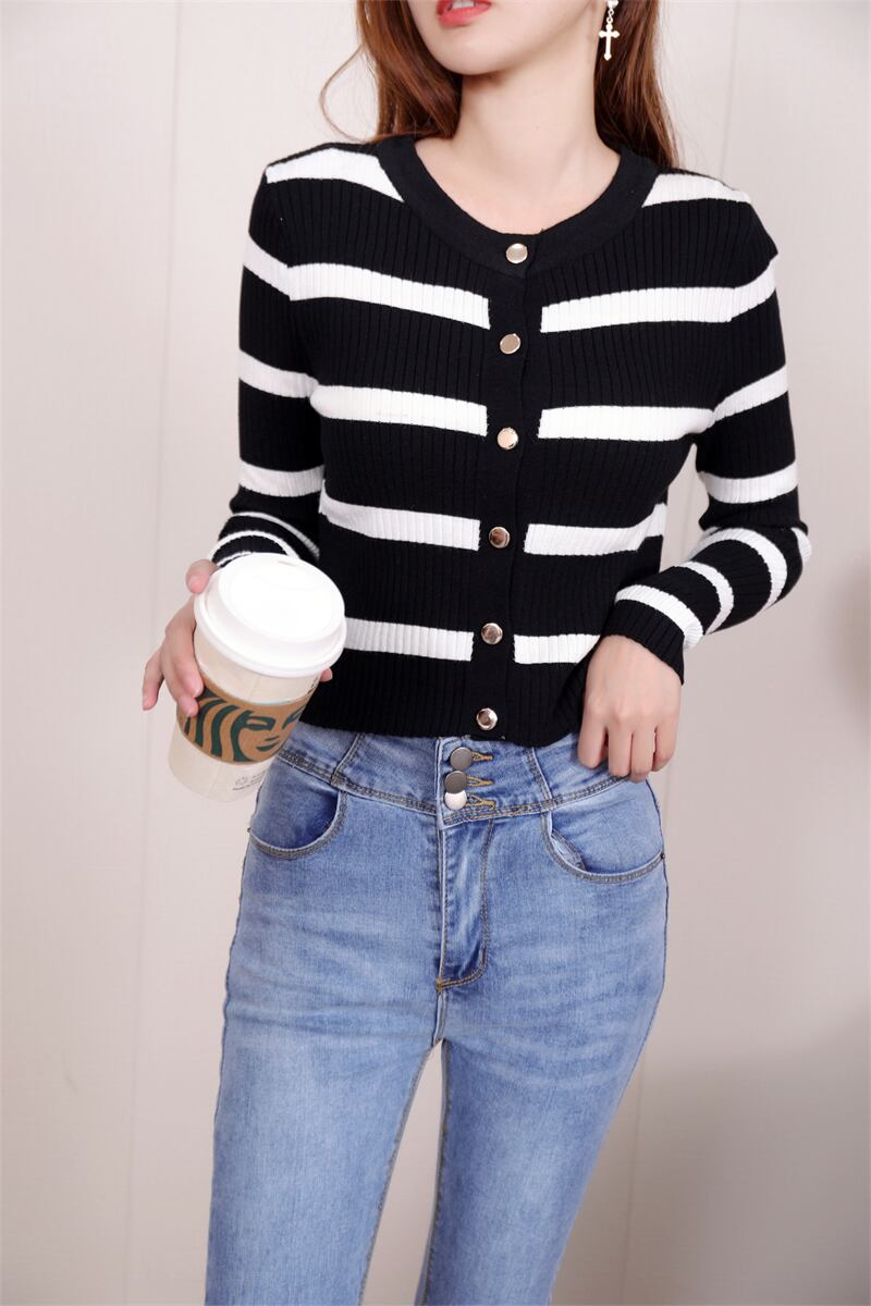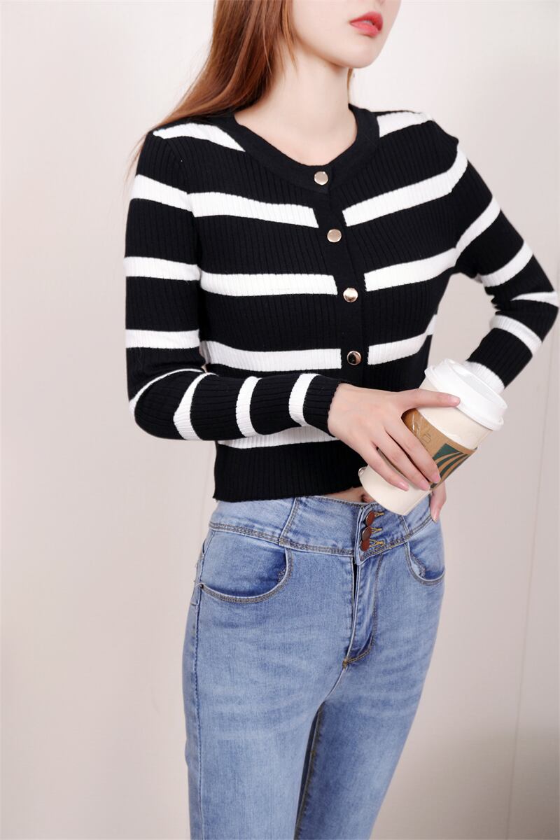 秋ニットセーター底長袖ストライプカーディガンセーター Tシャツジャンパー黒 Y2K トップス服 ロング ブラック オータム 秋物