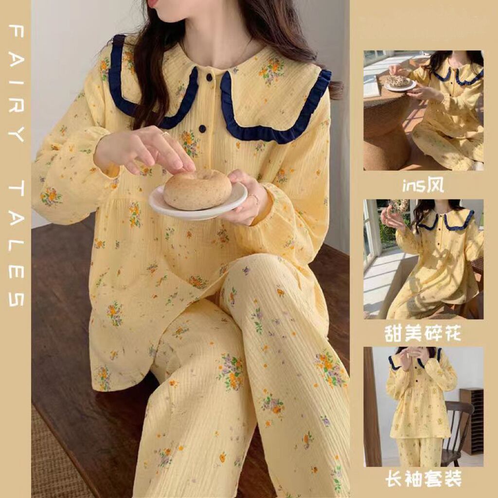 秋甘い女子ホームウェアフラワードールネックパジャマ長袖春ホームスパースターセットイエロールームウェア ロング 大人ガーリー スウィート キュート カジュアル スプリング 春物 オータム 秋物 フラワーデザイン