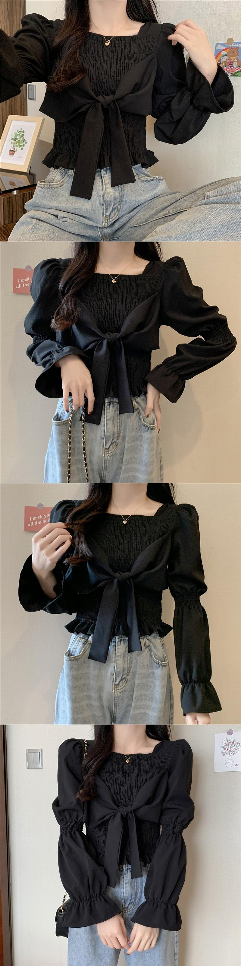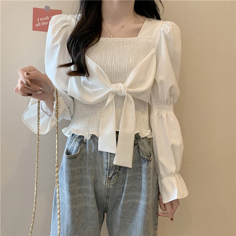 韓国弓ブラウスシャツ秋ランタンスリーブスクエアカラープルオーバークロップトップ若いルースソリッド blusas mujer リボン オータム 秋物 ソリッドカラー スクウェア