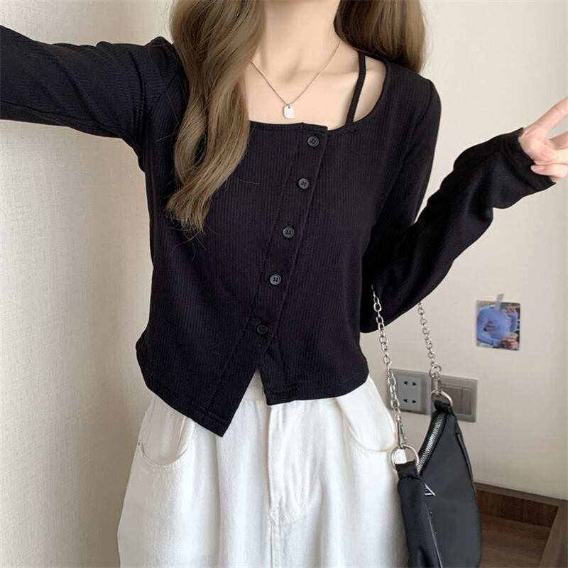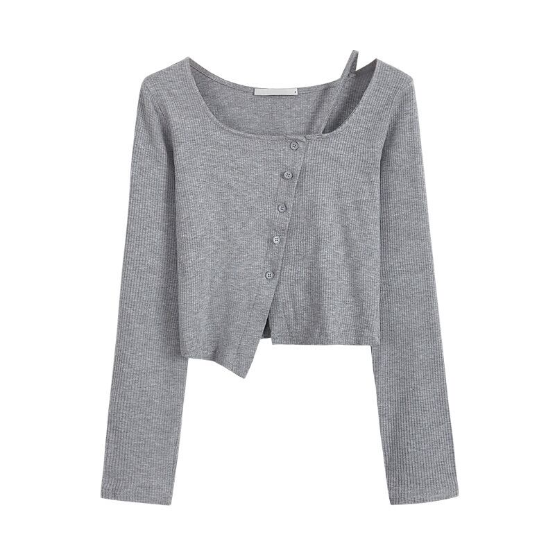 秋長袖 Tシャツ原宿不規則ボタンソリッド Tシャツ韓国 O ネックスリム Tシャツクロップトップス Tシャツ ロング かわいい オータム 秋物 Oネック ソリッドカラー