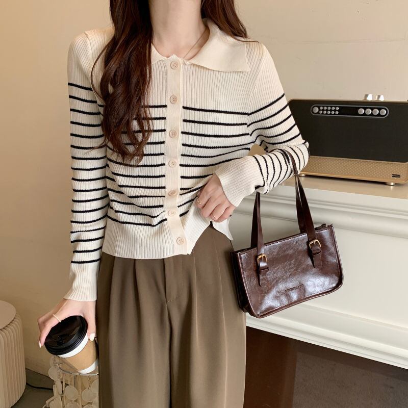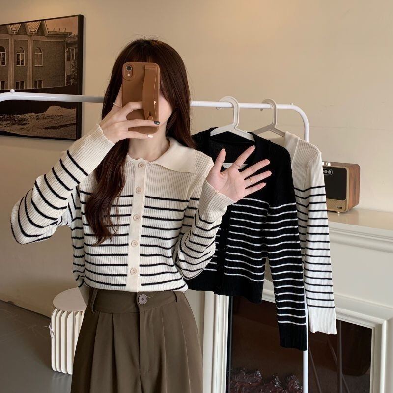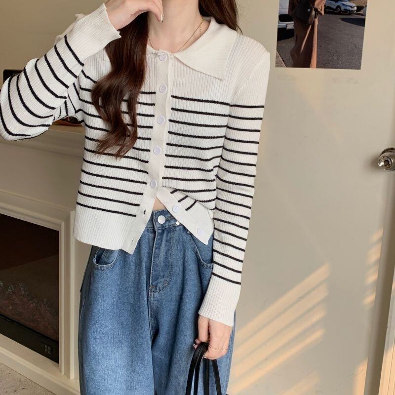 春秋ニットセーターオールマッチ長袖ストライプカーディガンセーター Tシャツジャンパートップス服 ロング スプリング 春物 オータム 秋物