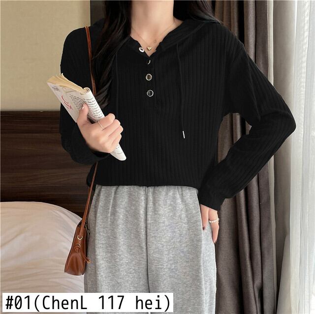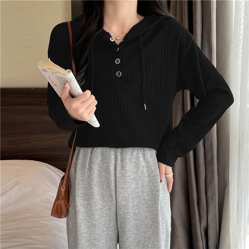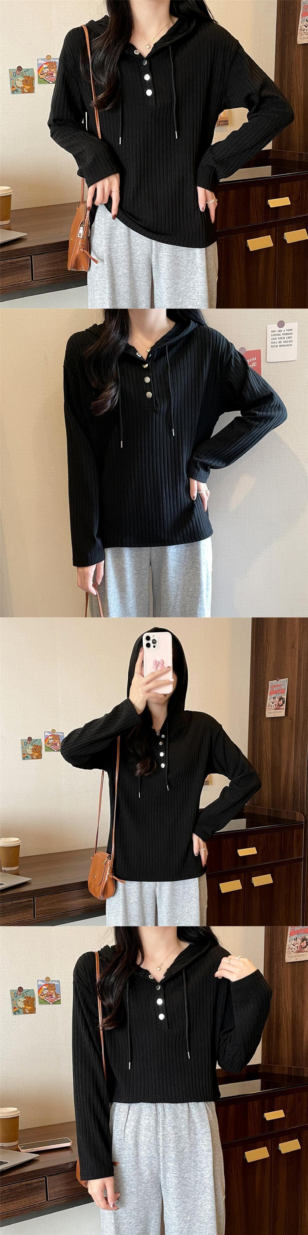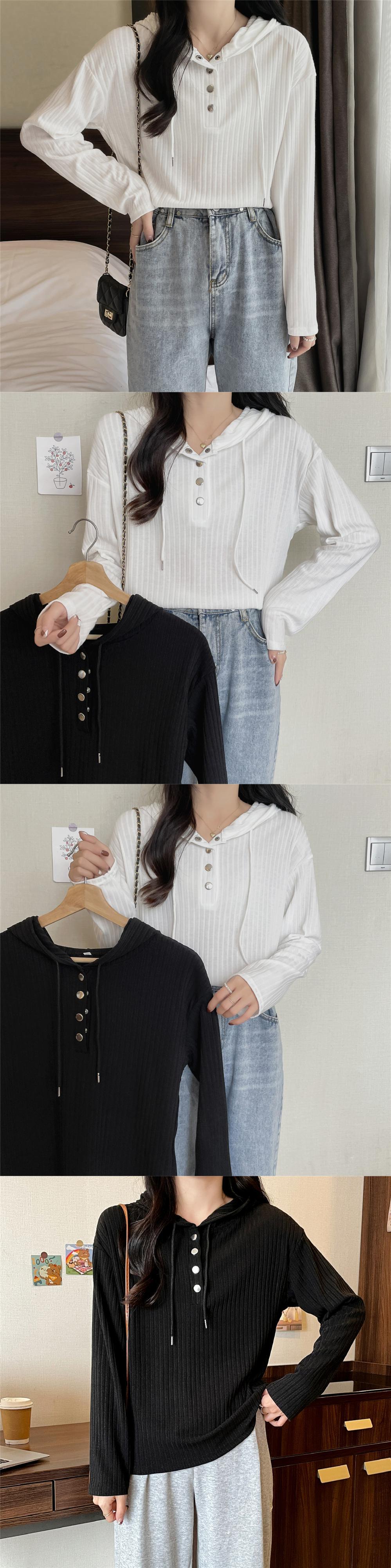 春秋長袖 Tシャツ服原宿ルーズソフトフード付き Tシャツボタンホワイトトップ Tシャツ ロング かわいい スプリング 春物 オータム 秋物 ソリッドカラー