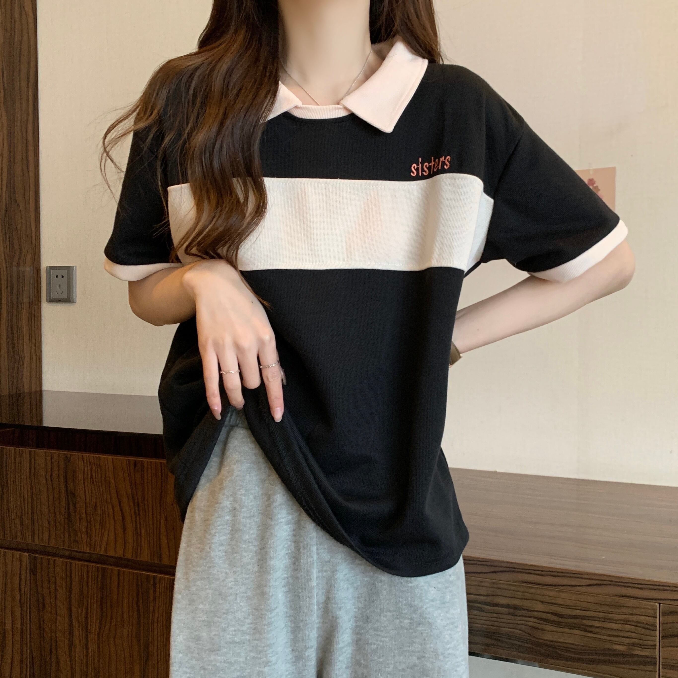 夏韓国半袖ストライプ tシャツ因果特大コットンカラーマッチング偽二枚 tシャツストリート ショート ハーフスリーブ サマー 夏物