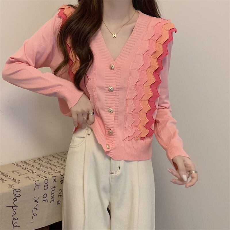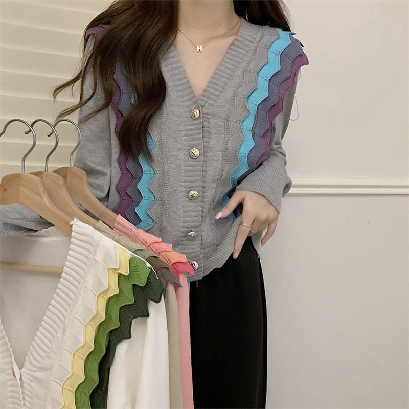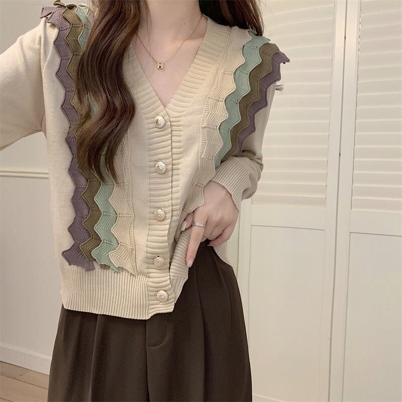 秋ニットセーターオールマッチ長袖カラーステッチカーディガンセーター Tシャツジャンパートップス服 ロング オータム 秋物