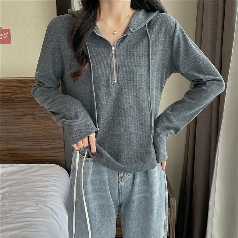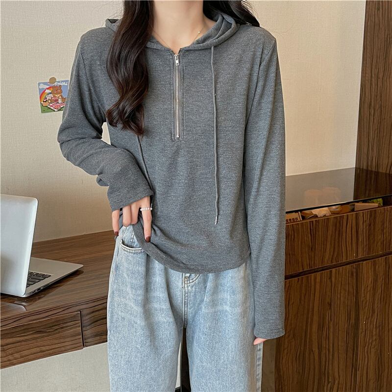 春秋長袖 Tシャツ服原宿ルーズジッパーフード付き Tシャツ若いグレー y2k トップス ロング かわいい スプリング 春物 オータム 秋物 ソリッドカラー