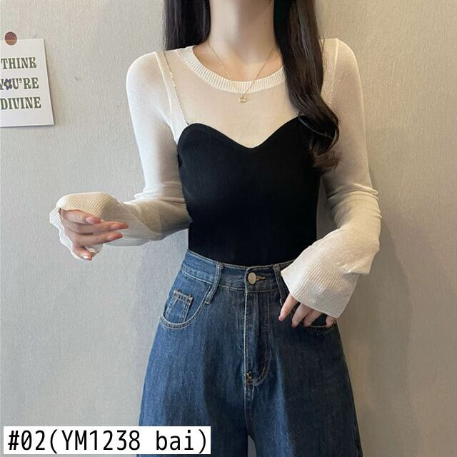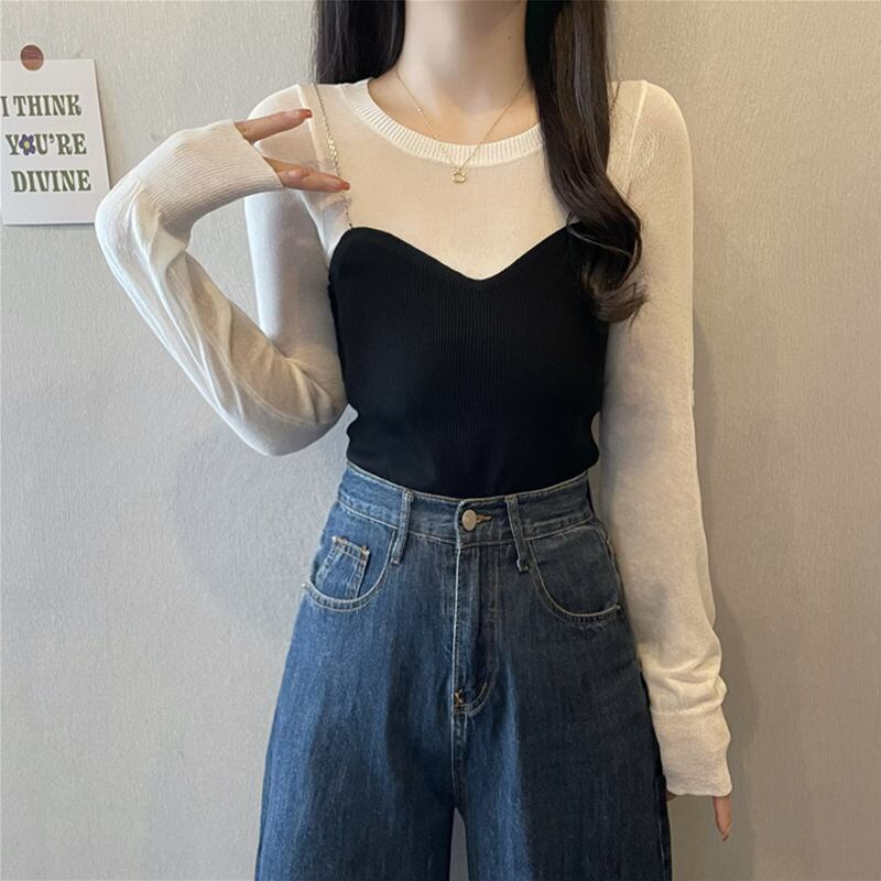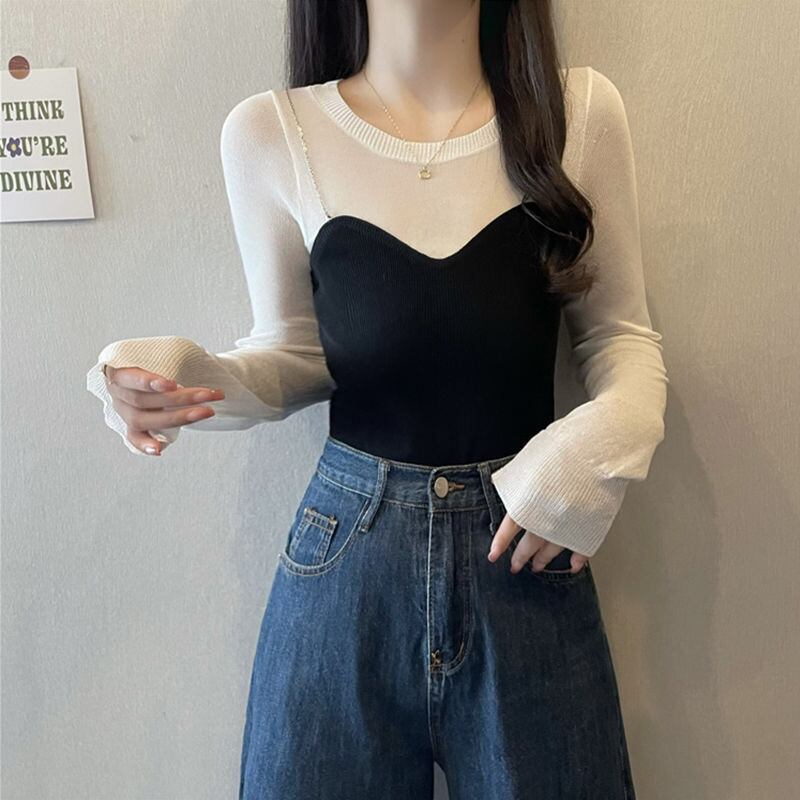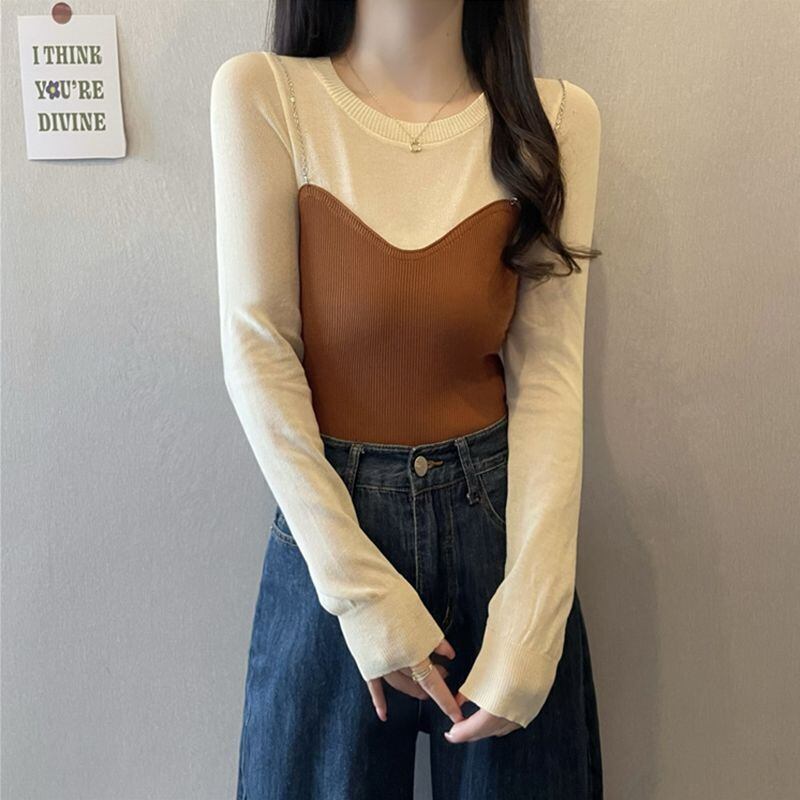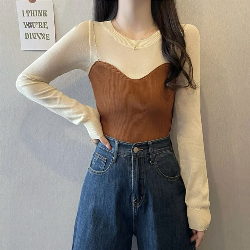 秋韓国偽二枚ニット底入れ tシャツクロップトップスセーターカラーブロックカジュアルスリムセータープルオーバー オータム 秋物