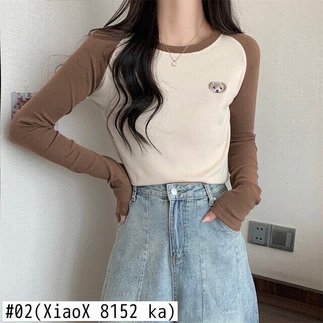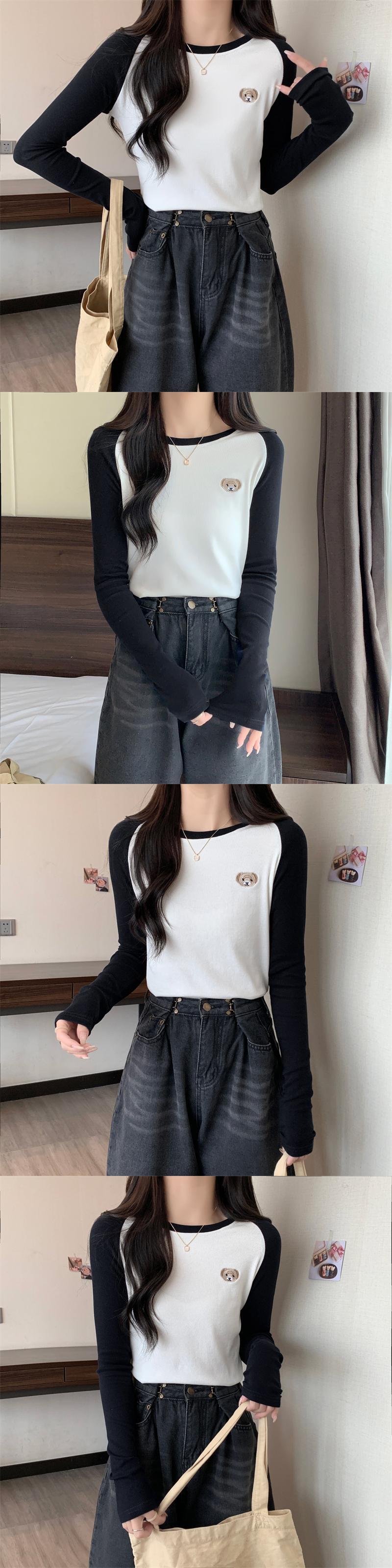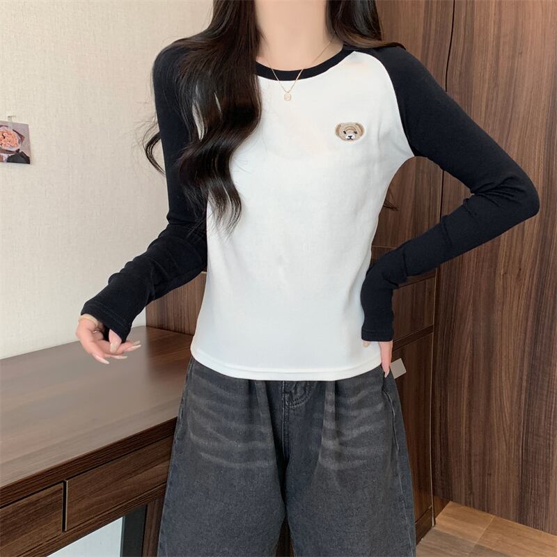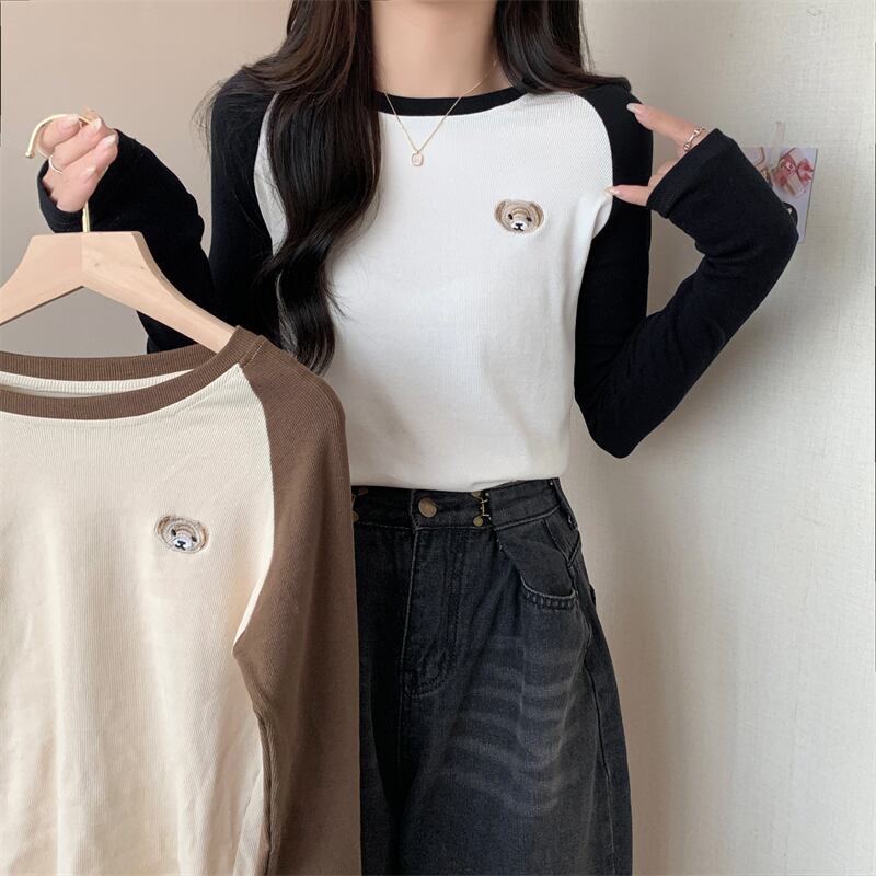 秋冬厚み暖かい Tシャツ韓国長袖刺繍カラーマッチングスリム底 Tシャツ原宿トップ ロング かわいい オータム 秋物 ウィンター 冬物