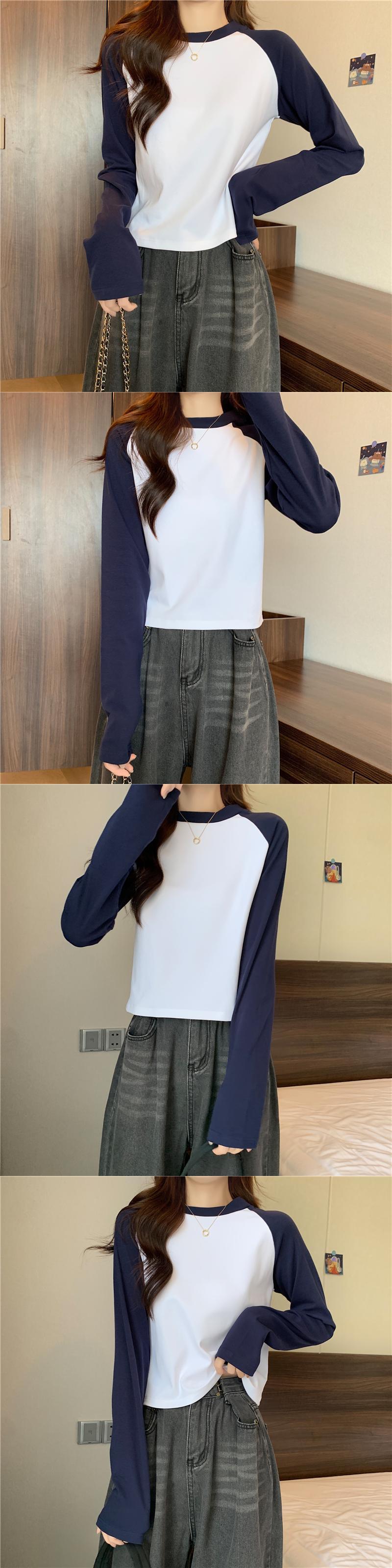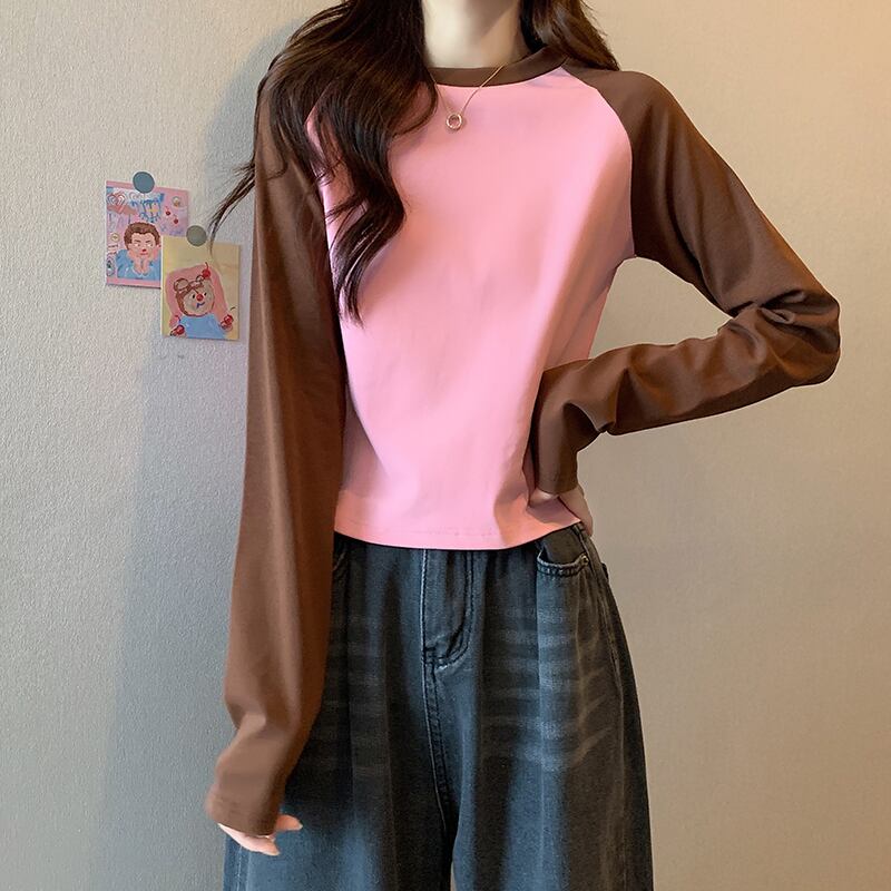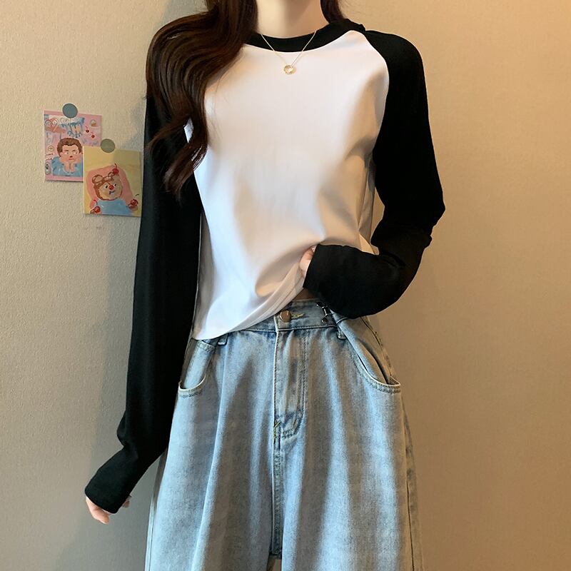 韓国長袖カラーステッチ Tシャツ O ネック純綿 Tシャツクロップトップス原宿スリム底入れ Tシャツ ロング コットン かわいい Oネック ピュア