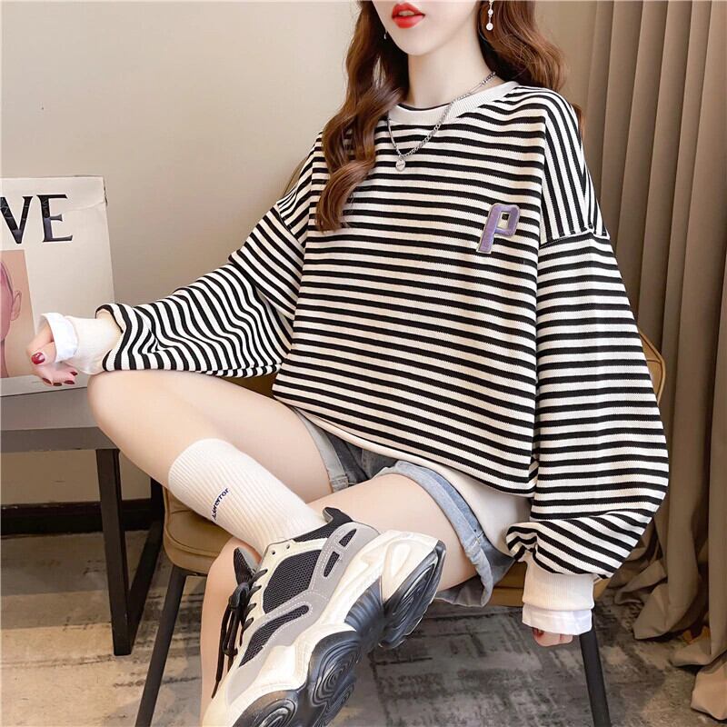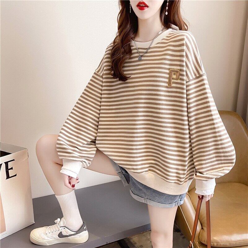 パーカー原宿刺繍ストライプ綿パーカー服秋長袖特大薄型トレーナー y2k プルオーバー ロング コットン かわいい オータム 秋物