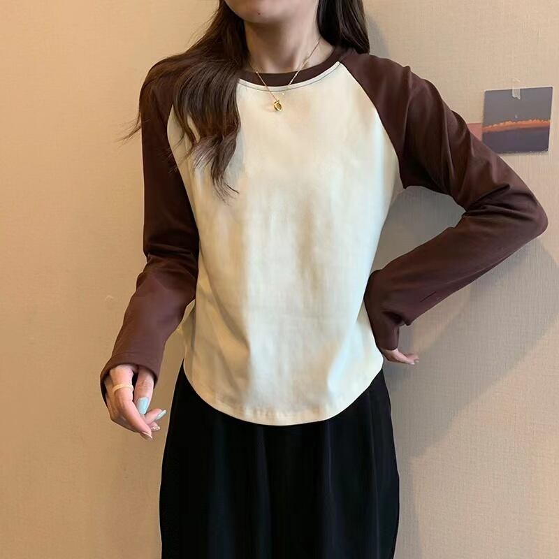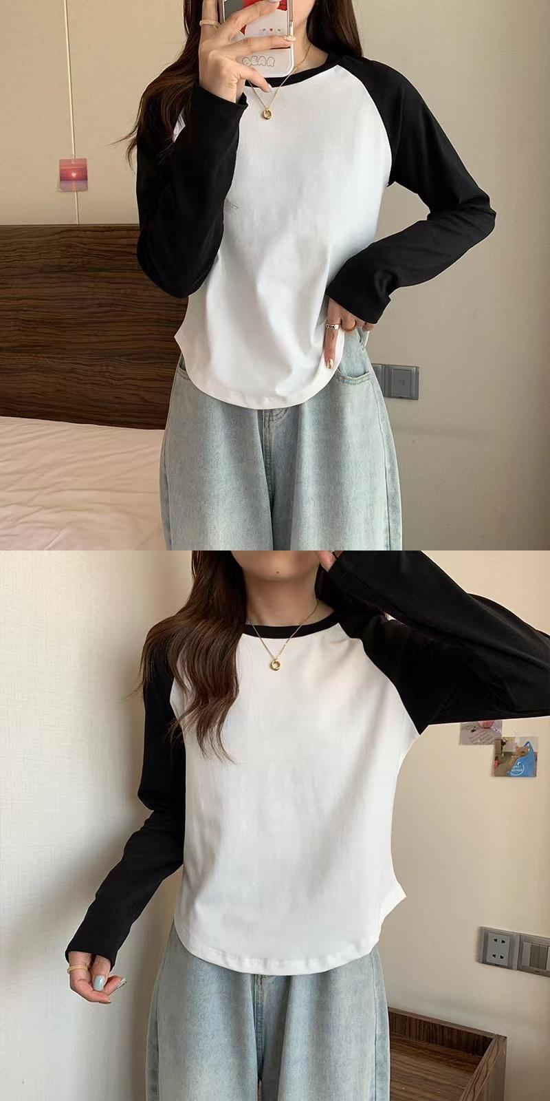 韓国長袖カラーステッチ Tシャツ O ネック不規則 Tシャツ若いトップ原宿スリム底 tシャツ ロング かわいい Oネック