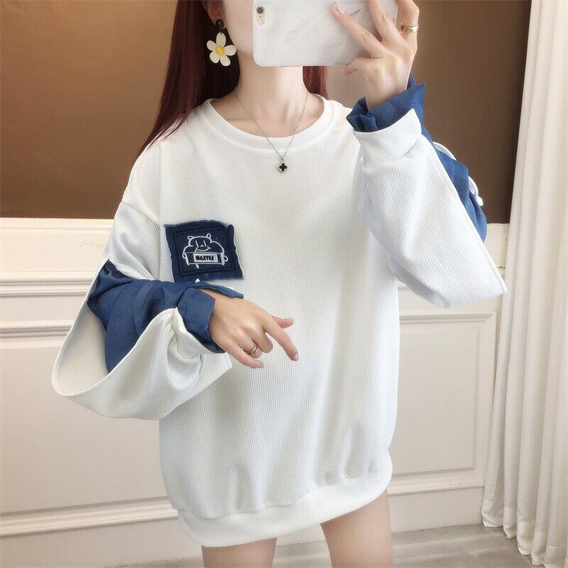 秋特大長袖漫画パーカープレッピースタイルデニムパッチワーク偽二枚薄いスウェットシャツプルオーバー ロング オータム 秋物