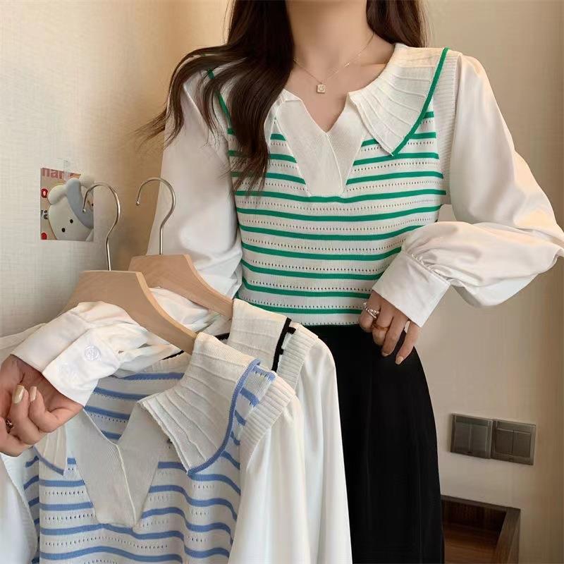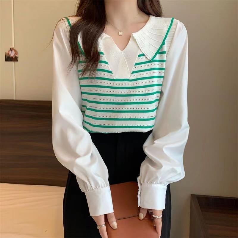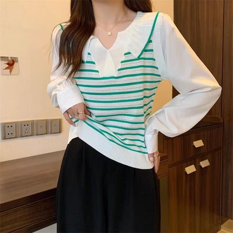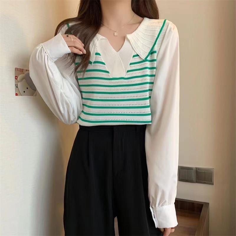 韓国ボトリングシャツ若いトップスストライプパッチワークカジュアルスリム v ネックニットセータープルオーバーオールマッチセーター Vネック
