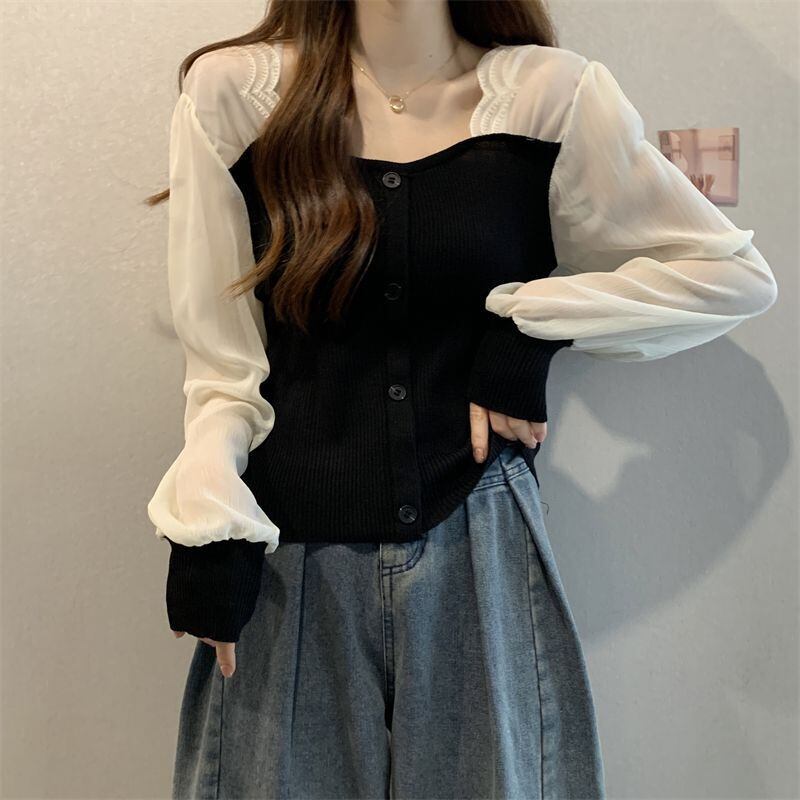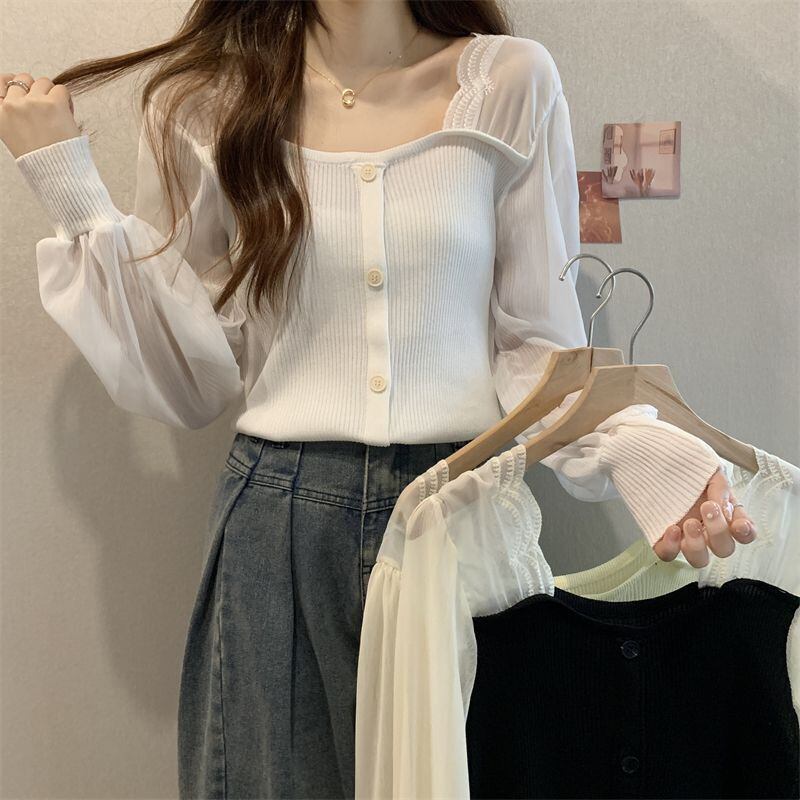 春秋ニットプルオーバーカジュアルスリム底シャツ韓国甘いシフォンパッチワークセータージャンパーセーター 大人ガーリー スウィート キュート スプリング 春物 オータム 秋物 ソリッドカラー
