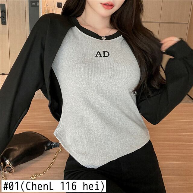 韓国長袖ボトムトレーナー秋偽二枚パーカー手紙不規則スリムクロップトップス服 ロング オータム 秋物