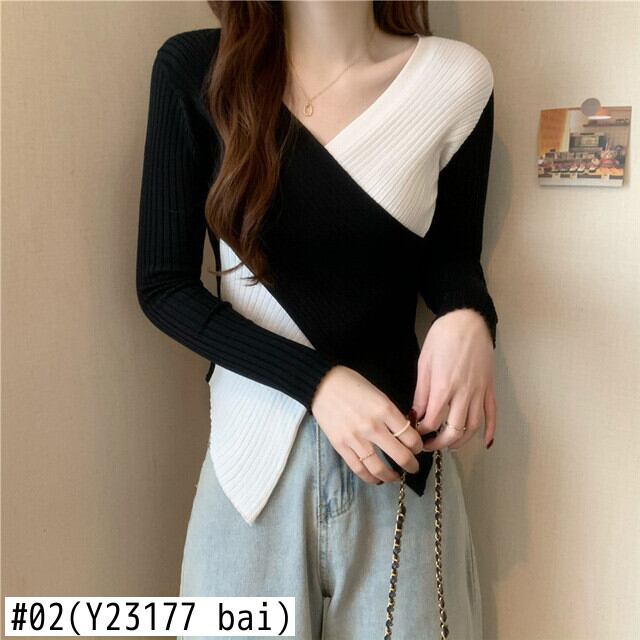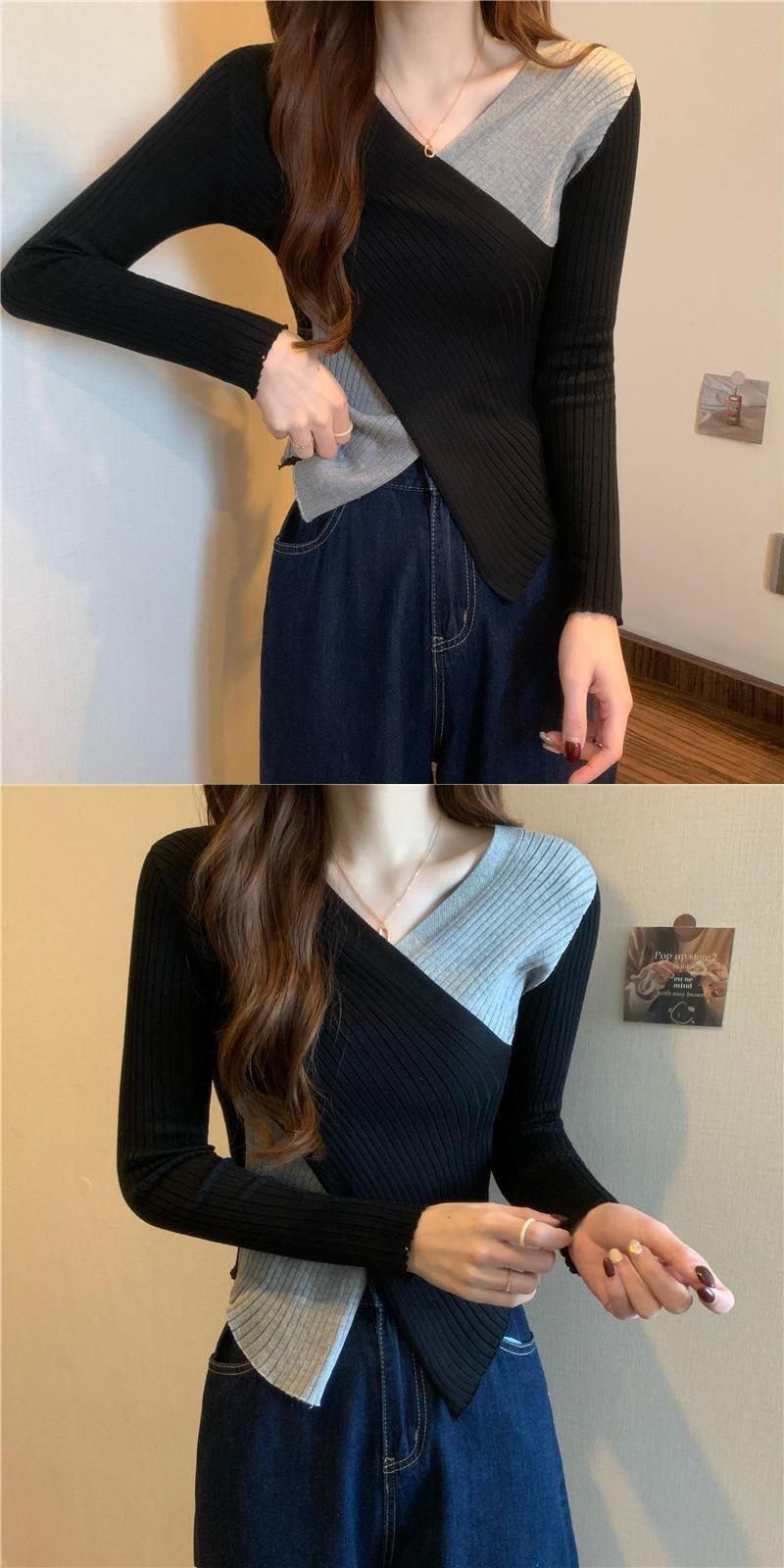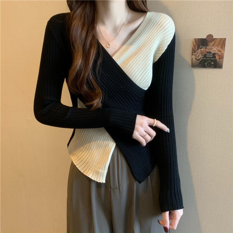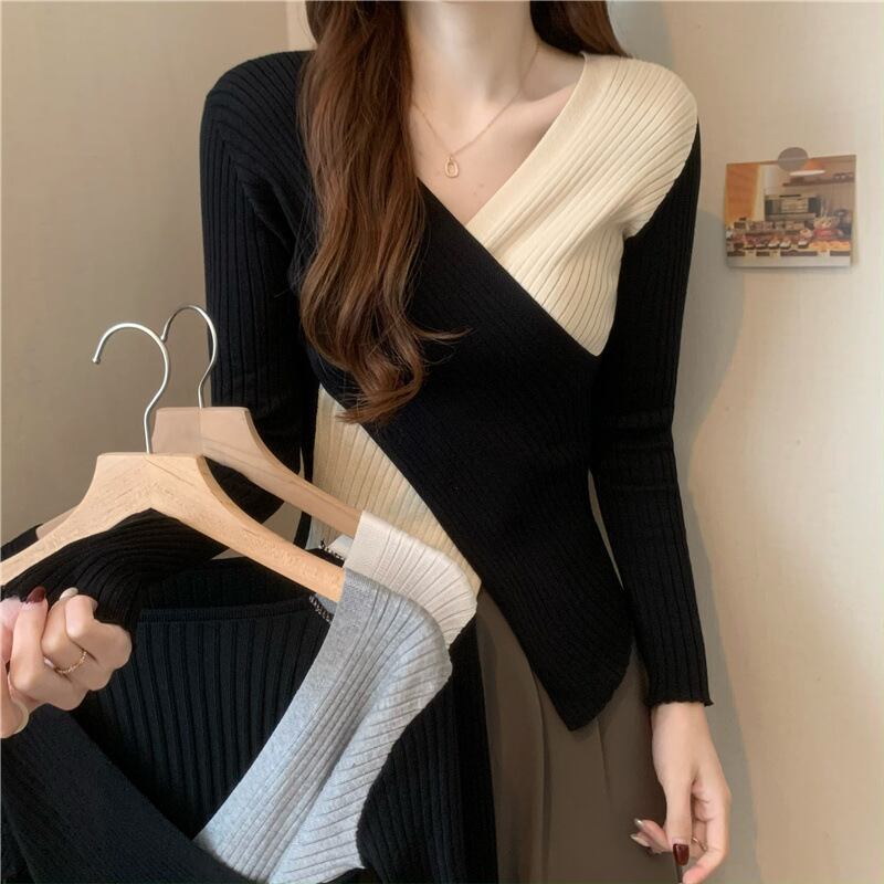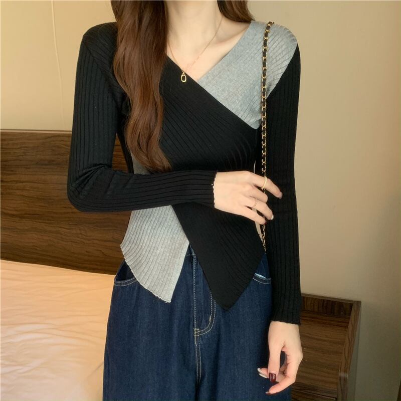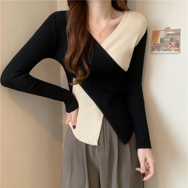 原宿不規則カラーステッチセーター秋ニットプルオーバー V ネックスリムボトニングニットジャンパーベーシックセーター かわいい オータム 秋物 Vネック