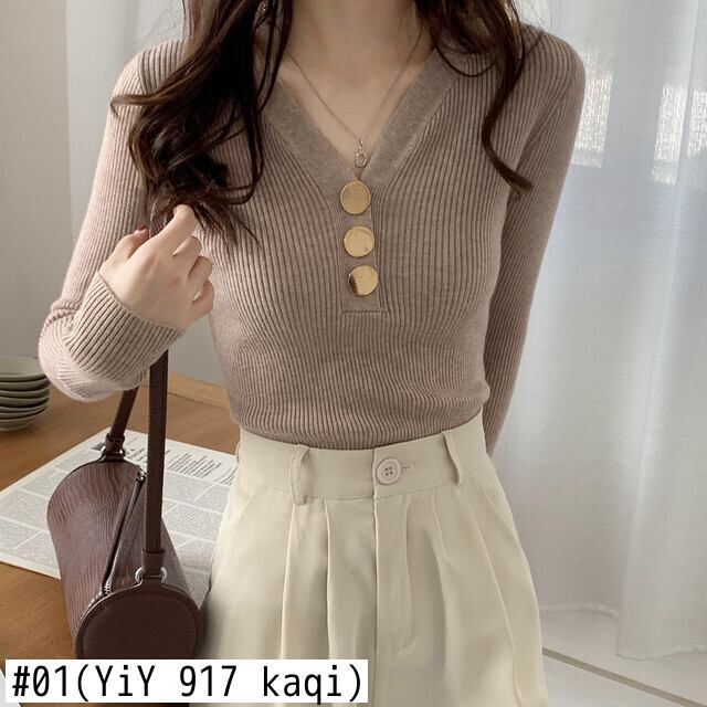 韓国メタルボタン v ネック底セータープルオーバー秋ニットセータースリム長袖 badycon セーター ロング オータム 秋物 Vネック ソリッドカラー