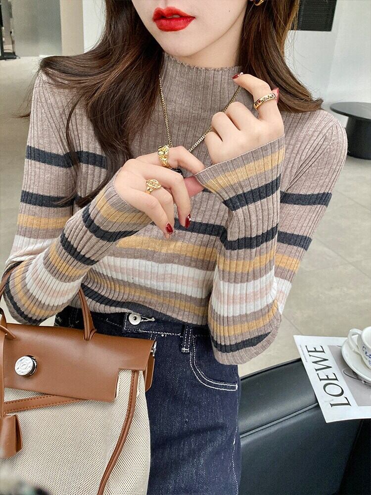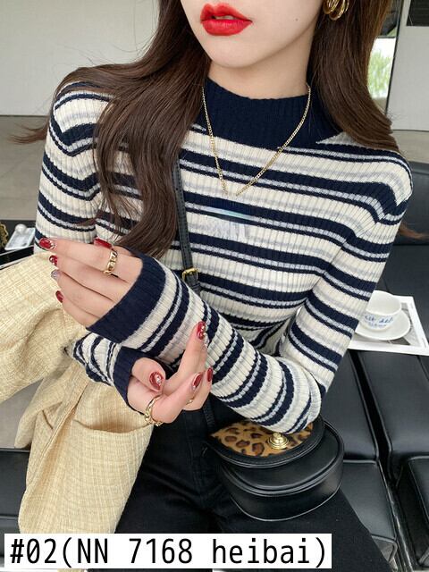 春秋ストライプハーフタートルネックニットセータースリム bace プルオーバートップス長袖ストリートセーター ロング スプリング 春物 オータム 秋物