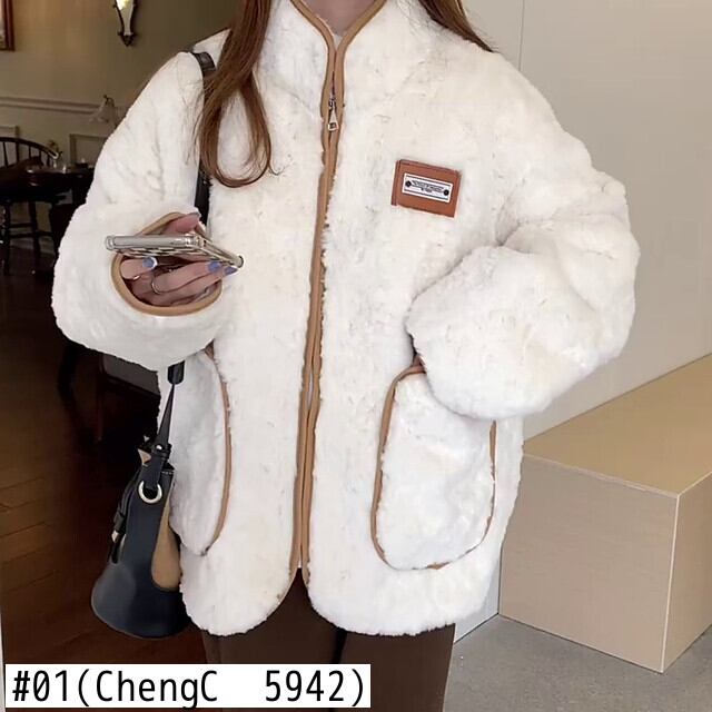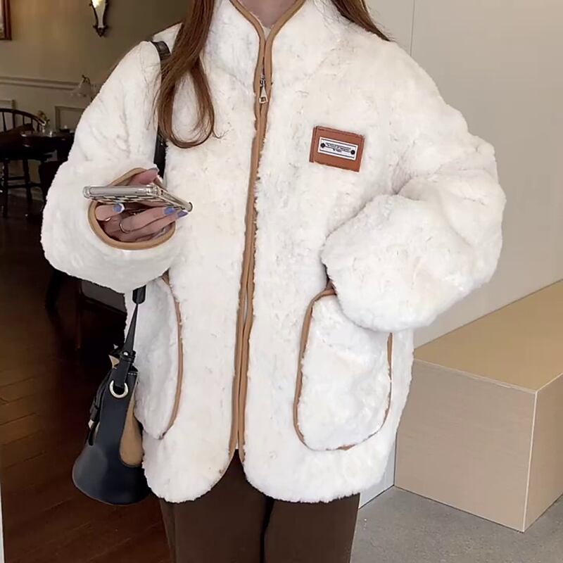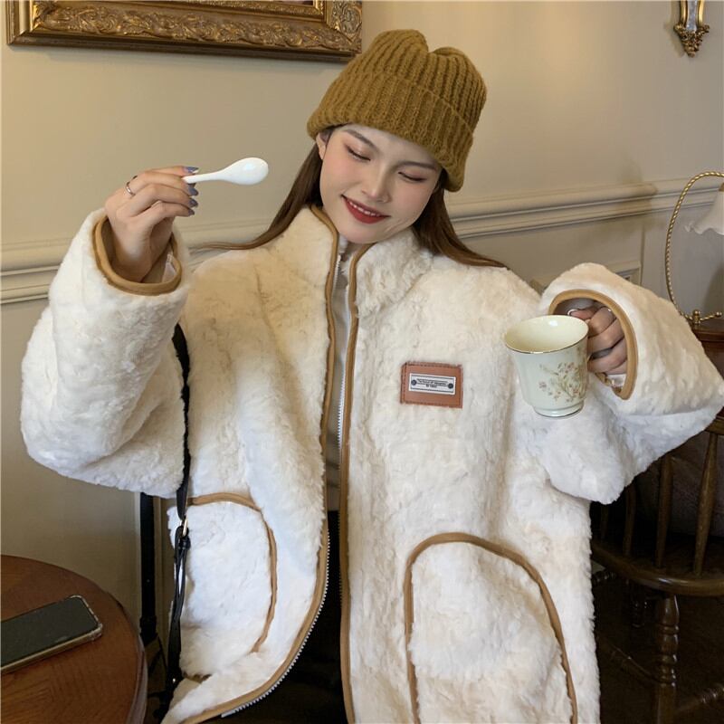 原宿韓国オーバーコートポケット生き抜く秋冬ジッパーパッチワークジャケットコート子羊ウールコートジャケット かわいい オータム 秋物 ウィンター 冬物