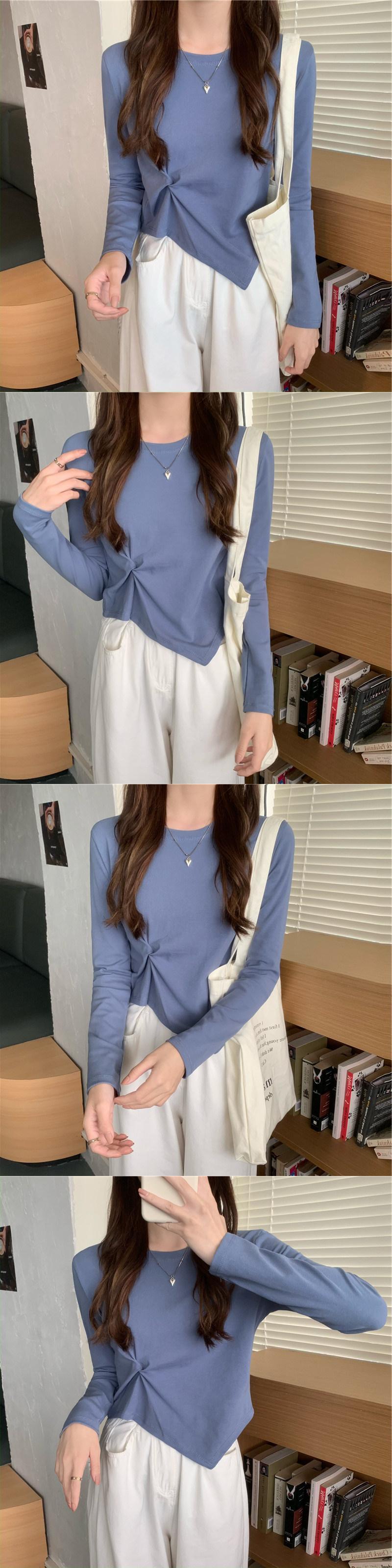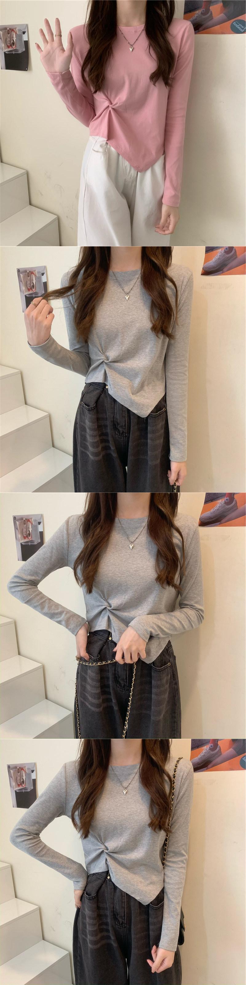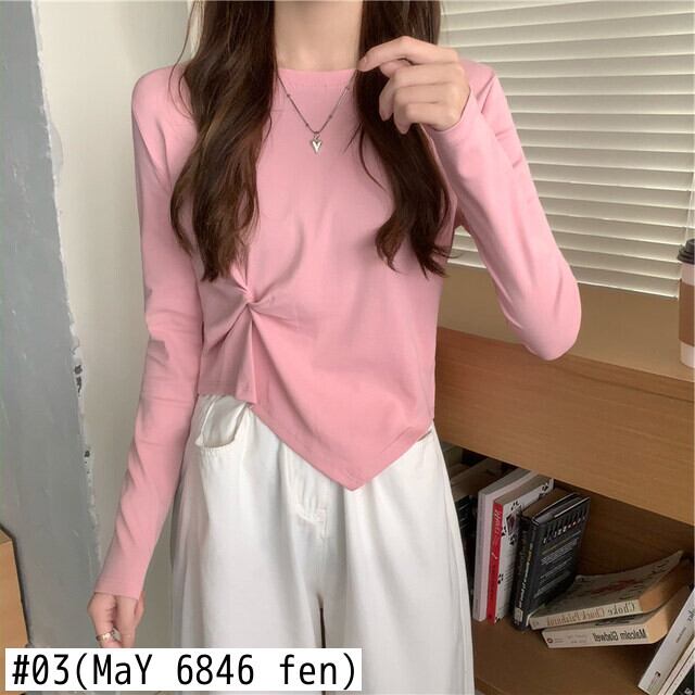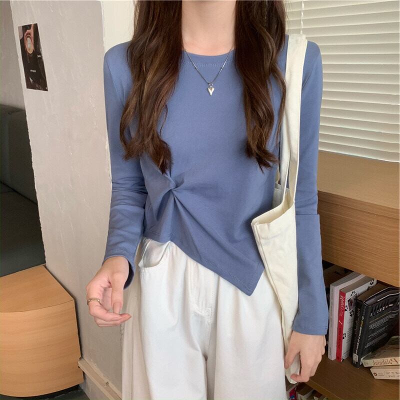 秋 Tシャツスリム不規則もつれアップ Tシャツ若い長袖薄い白トップス基本的 Tシャツ y2k 服 ロング ホワイト オータム 秋物