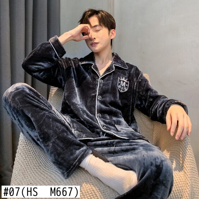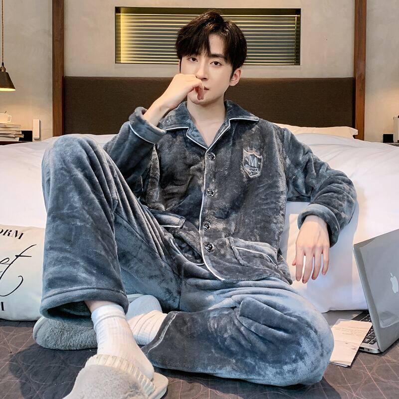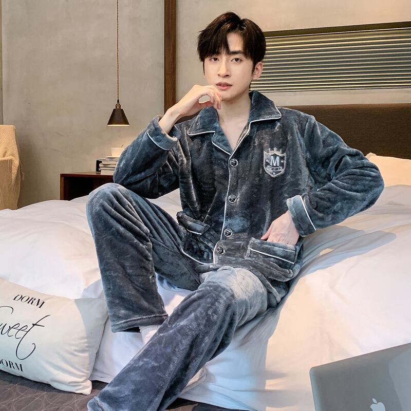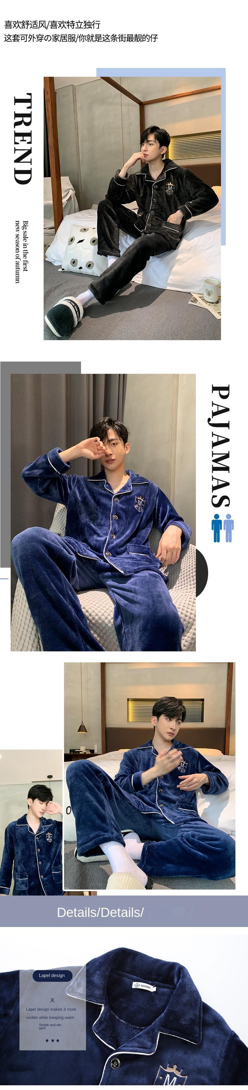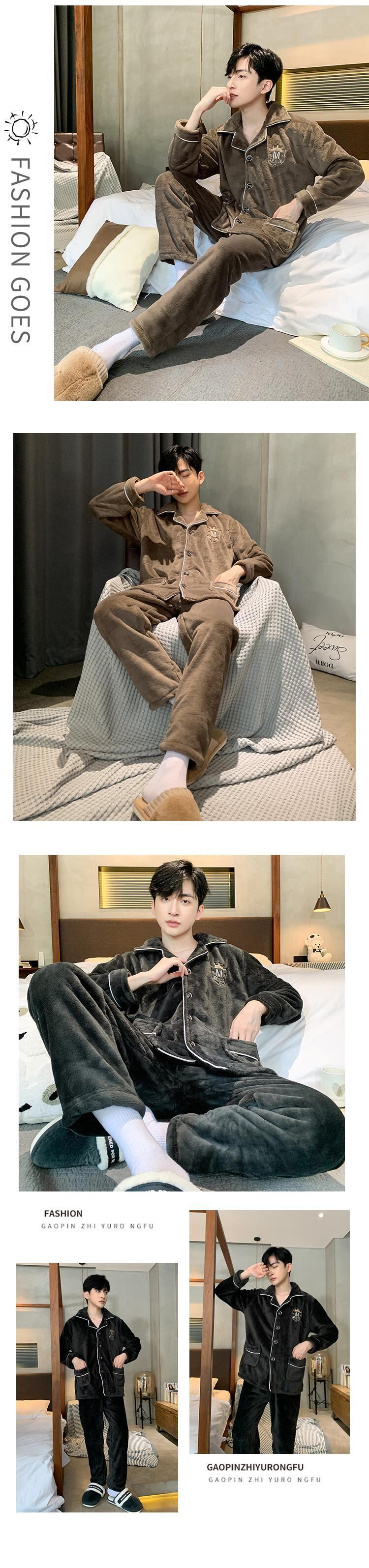 冬サンゴベルベットボタンカーディガンパジャマスーツ長袖厚く暖かいフランネルパジャマセット男性パジャマホームウェア服 ロング ウィンター 冬物