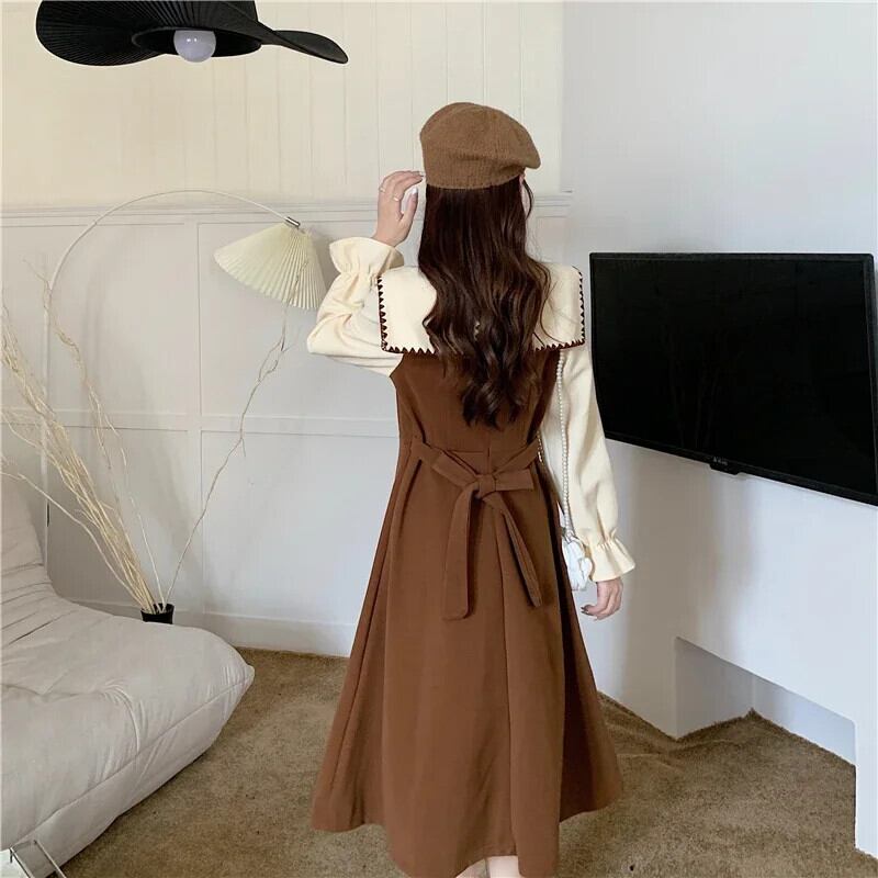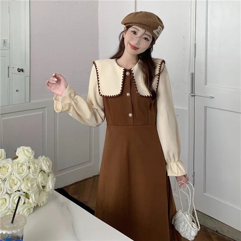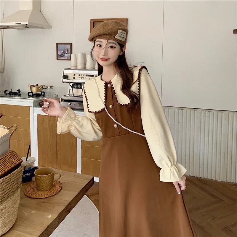 韓国コーデュロイ長袖ルーズマキシドレス秋冬カラーマッチングボディコンドレス厚いパーティーvestidos ロング オータム 秋物 ウィンター 冬物