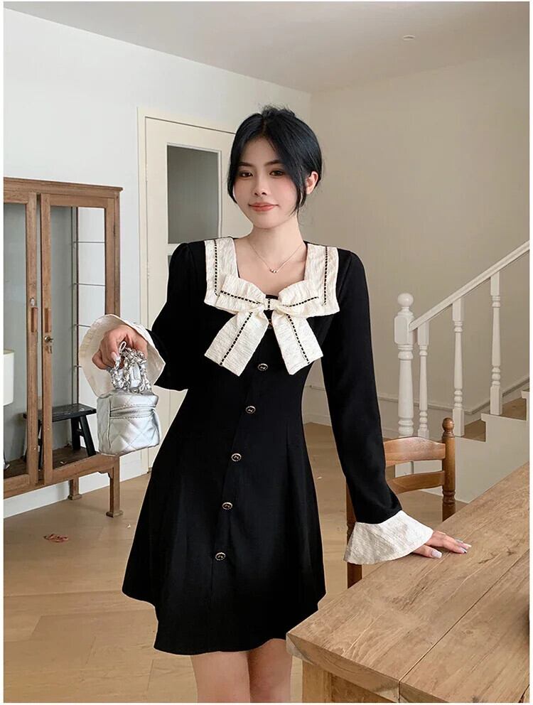 弓マキシドレス韓国カラーマッチングスリムウエスト A ラインドレス長袖 y2k ボディコンドレス ロング リボン Aライン