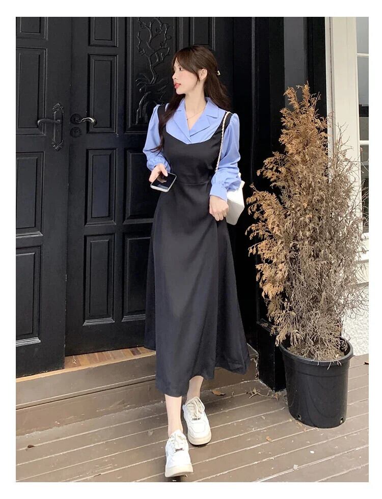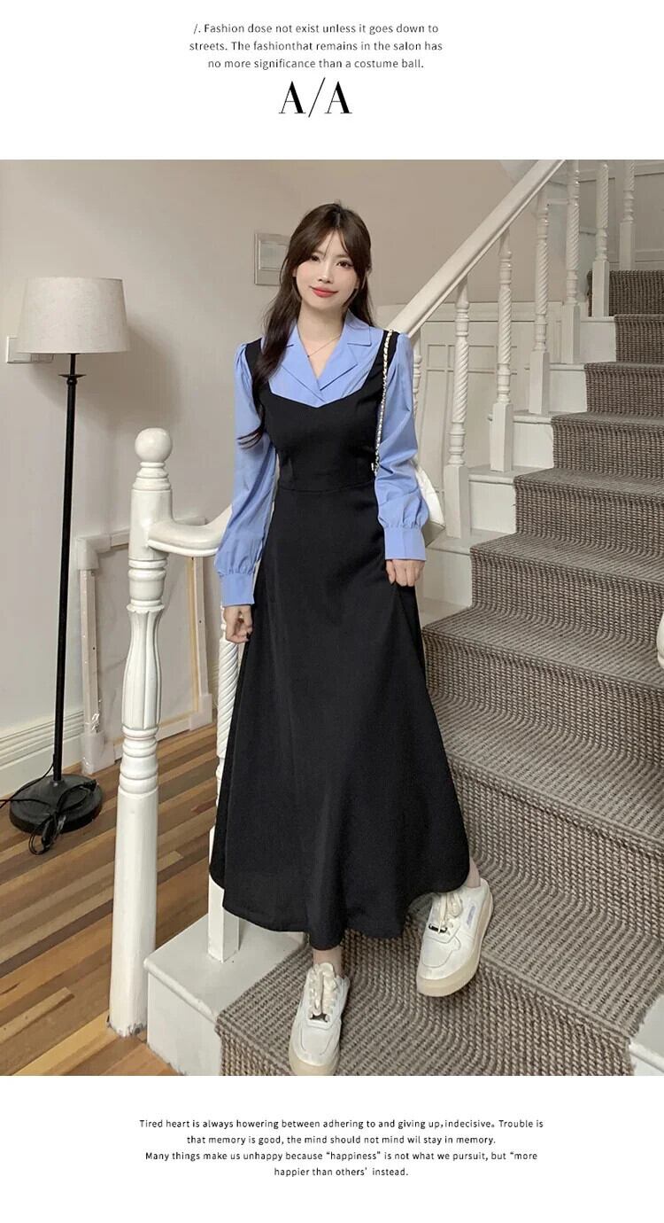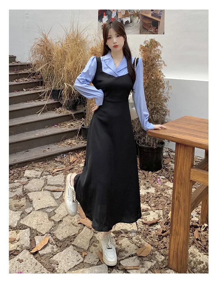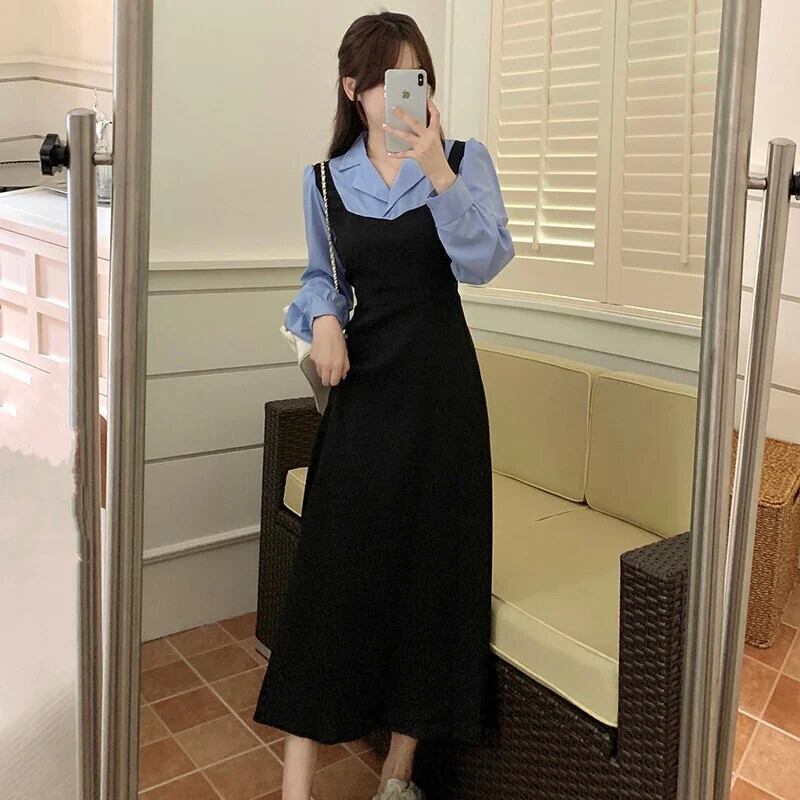 フレンチエレガントカラーステッチフェイクツーピースパーティードレス秋長袖ボディコンドレスルーズドレス Vestidos ロング オータム 秋物