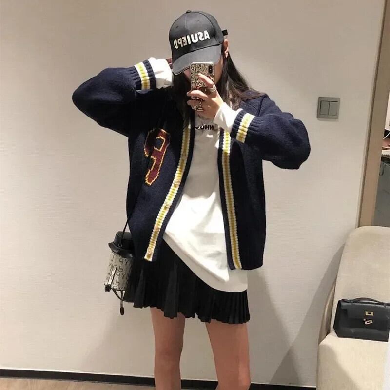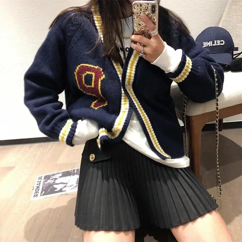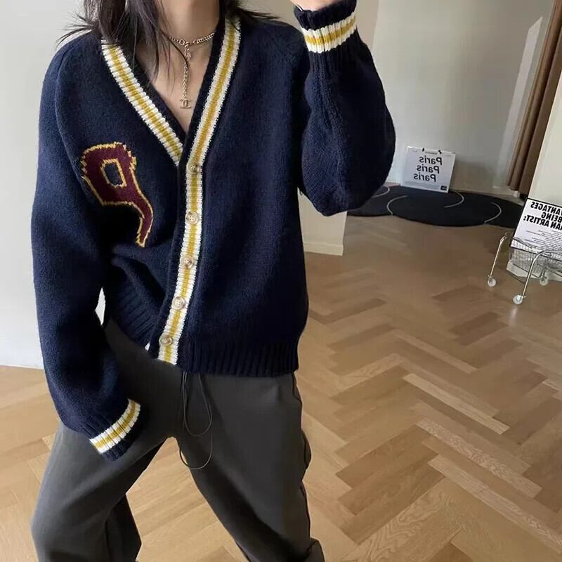 韓国ボタンアップ V ネック長袖コートプレッピースタイル手紙ニットカーディガンジャケット春秋 Y2K 美学グリーンセーター ロング スプリング 春物 オータム 秋物 Vネック