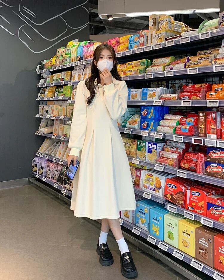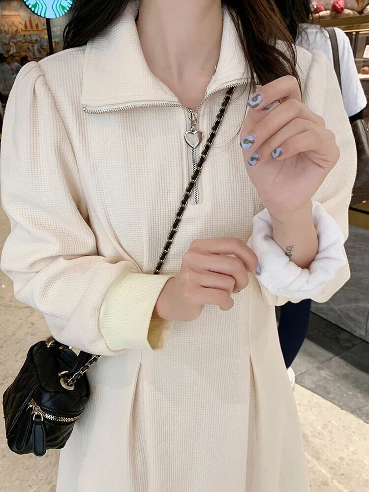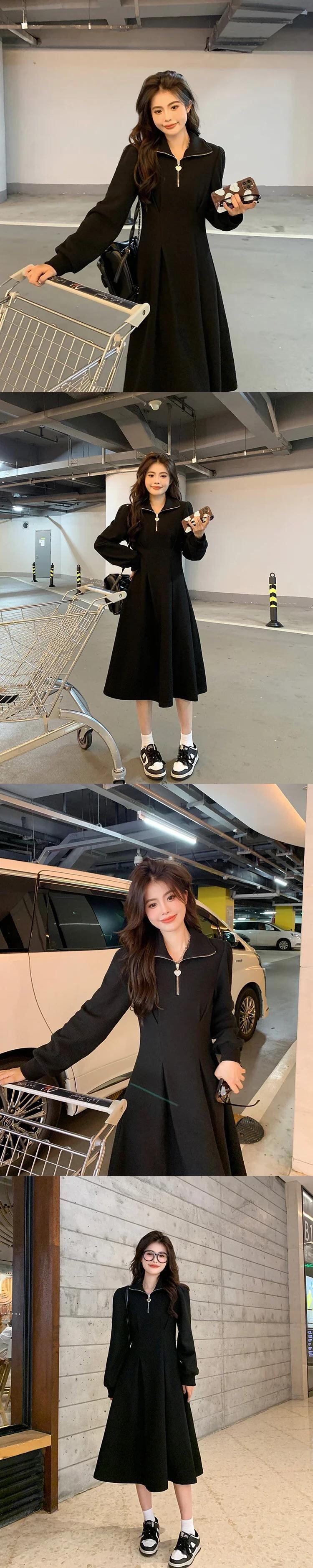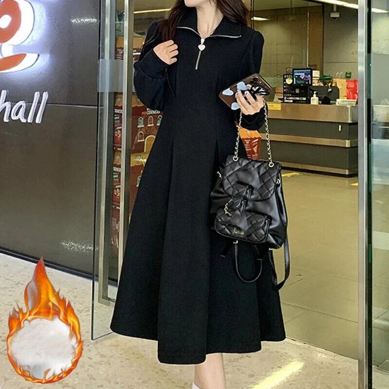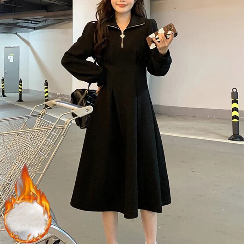 韓国 A ラインフリース暖かいドレス秋冬ベルベット肥厚ドレスポロ襟ウエストマキシドレス オータム 秋物 ウィンター 冬物 Aライン ソリッドカラー