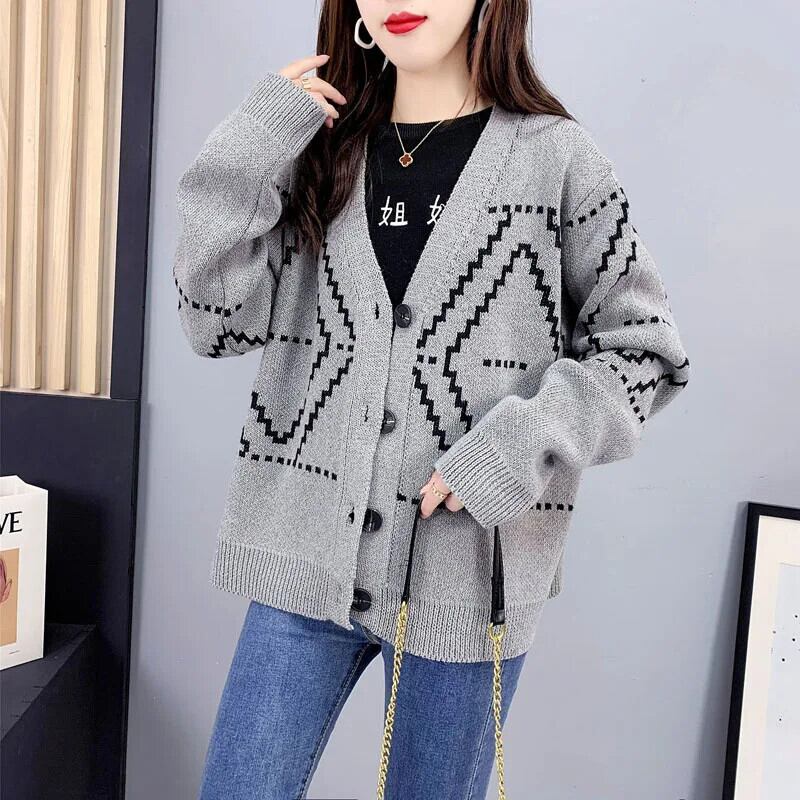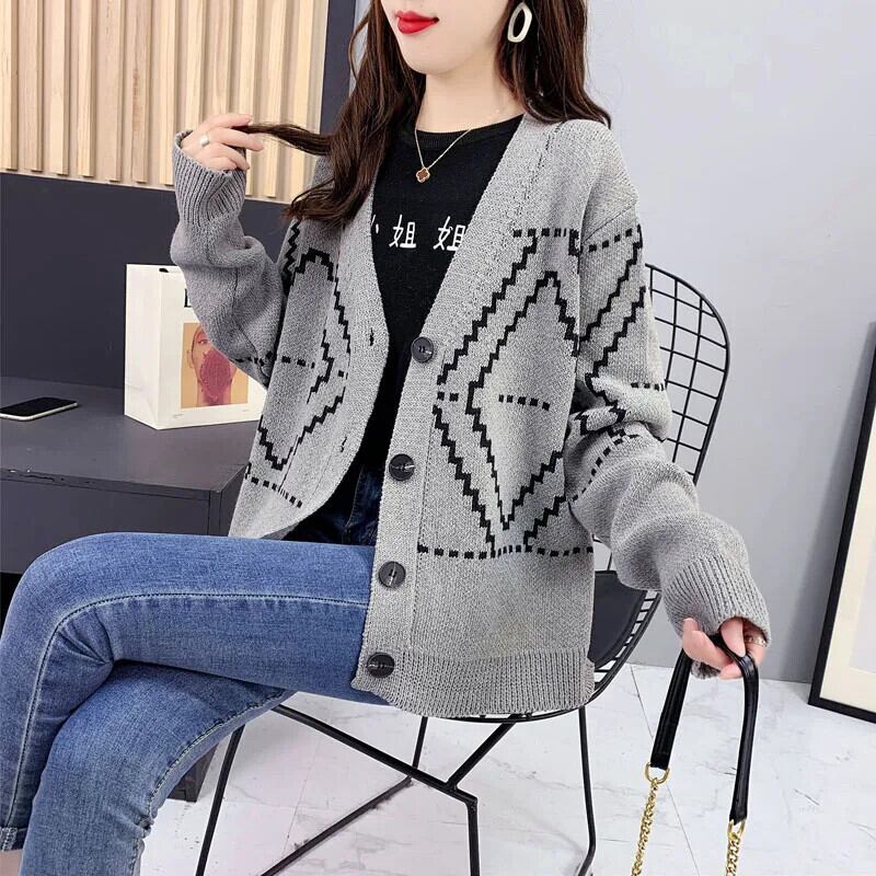 セーターニットカーディガンシングルブレストダイヤモンド V ネック長袖日常グレー y2k セーター ロング Vネック