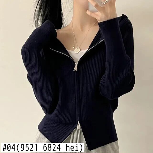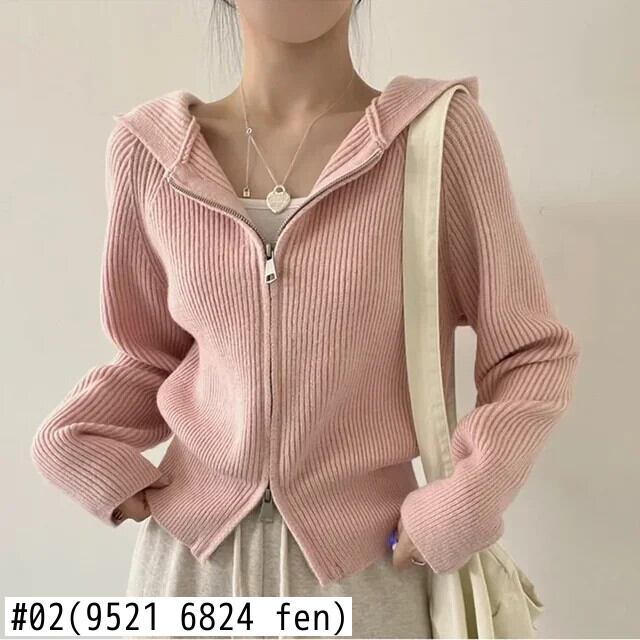 韓国長袖アプリコットショートコートトップセーター秋冬ジッパーニットカーディガンカジュアルルーズフード付きセーター ロング オータム 秋物 ウィンター 冬物 ソリッドカラー