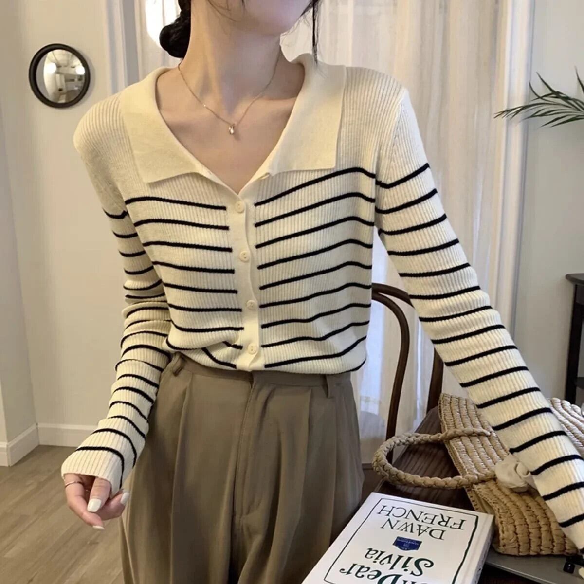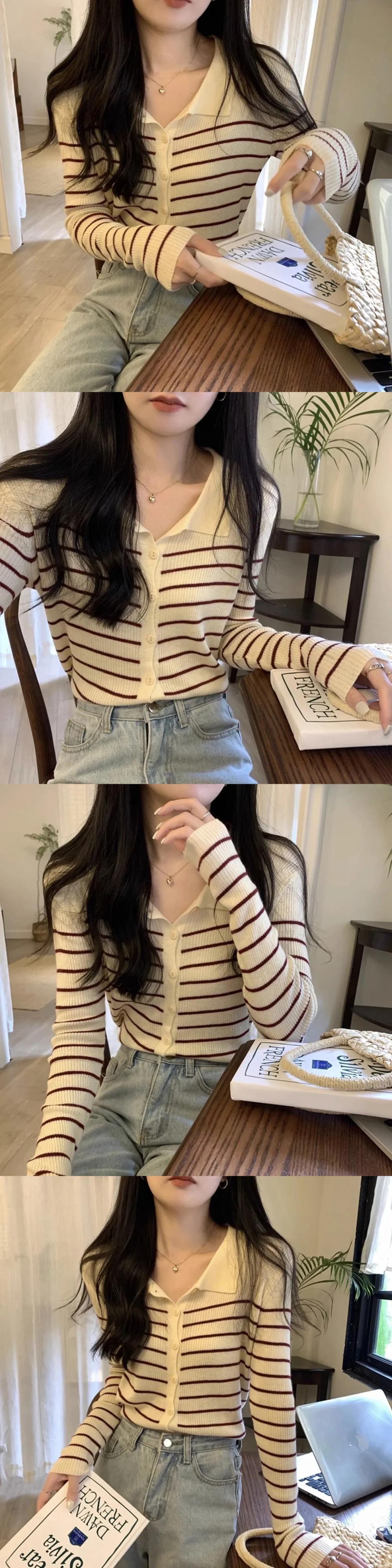 ジャンパーソフトポロカラーストライプセーター春秋セーターカーディガンシングルブレスト長袖生き抜く ロング スプリング 春物 オータム 秋物