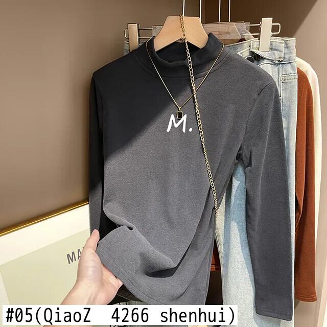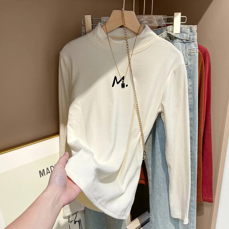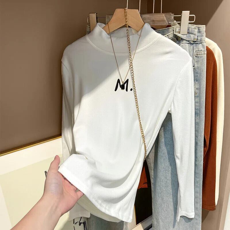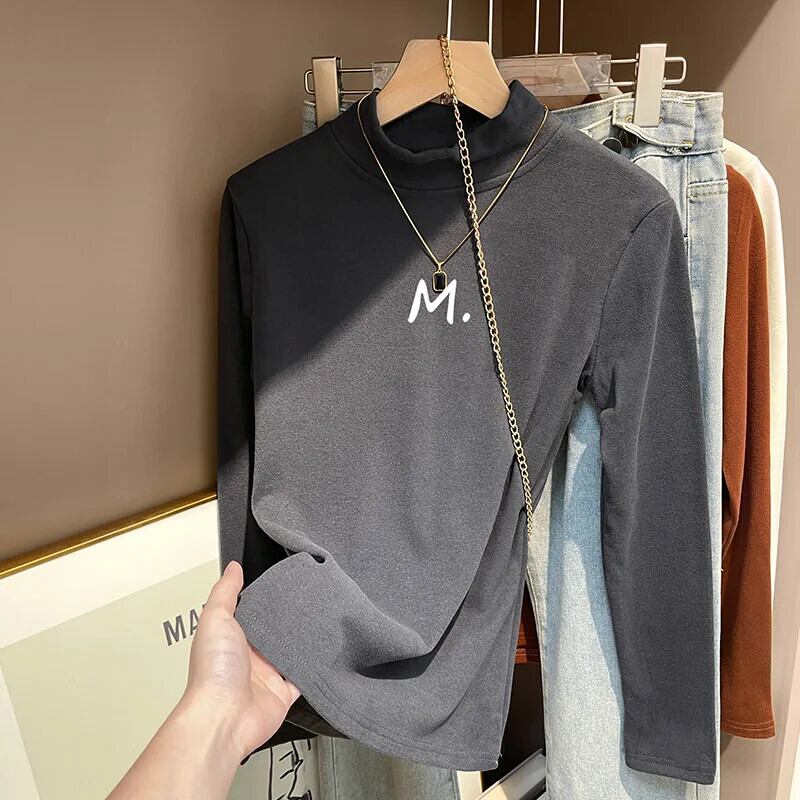 原宿ハーフタートルネックスリム厚底 Tシャツ秋冬ベルベット長袖レタープリント Tシャツ y2k トップ ロング かわいい オータム 秋物 ウィンター 冬物