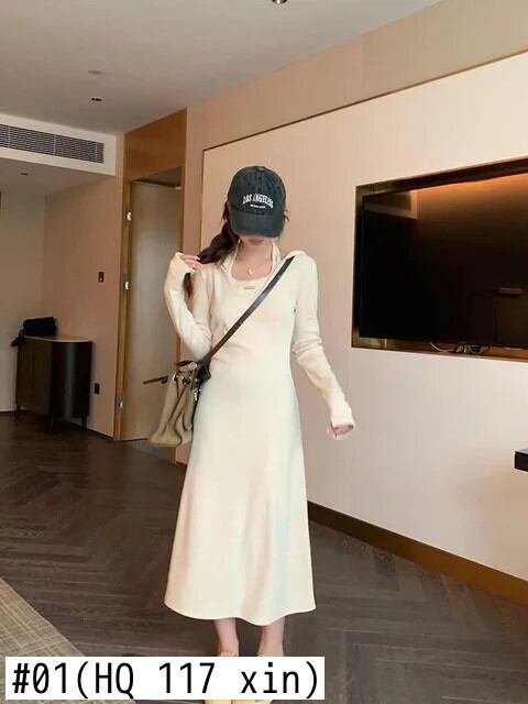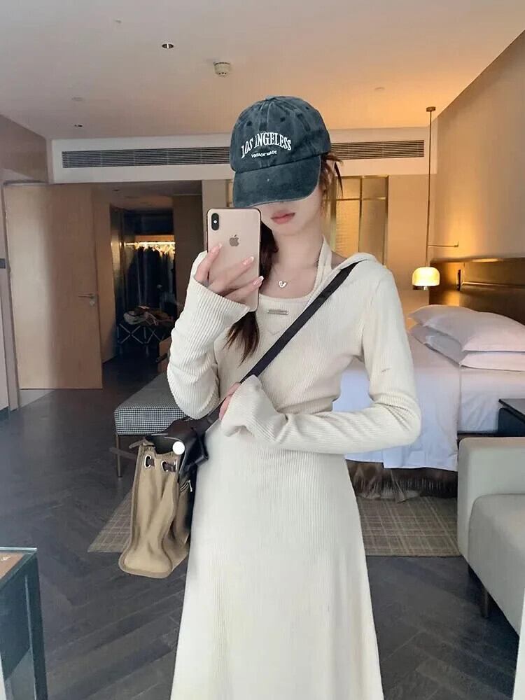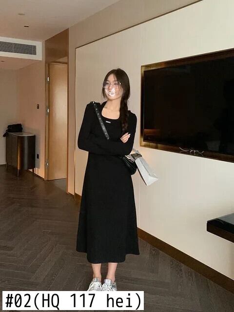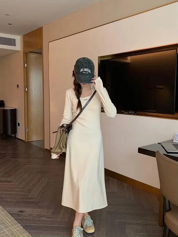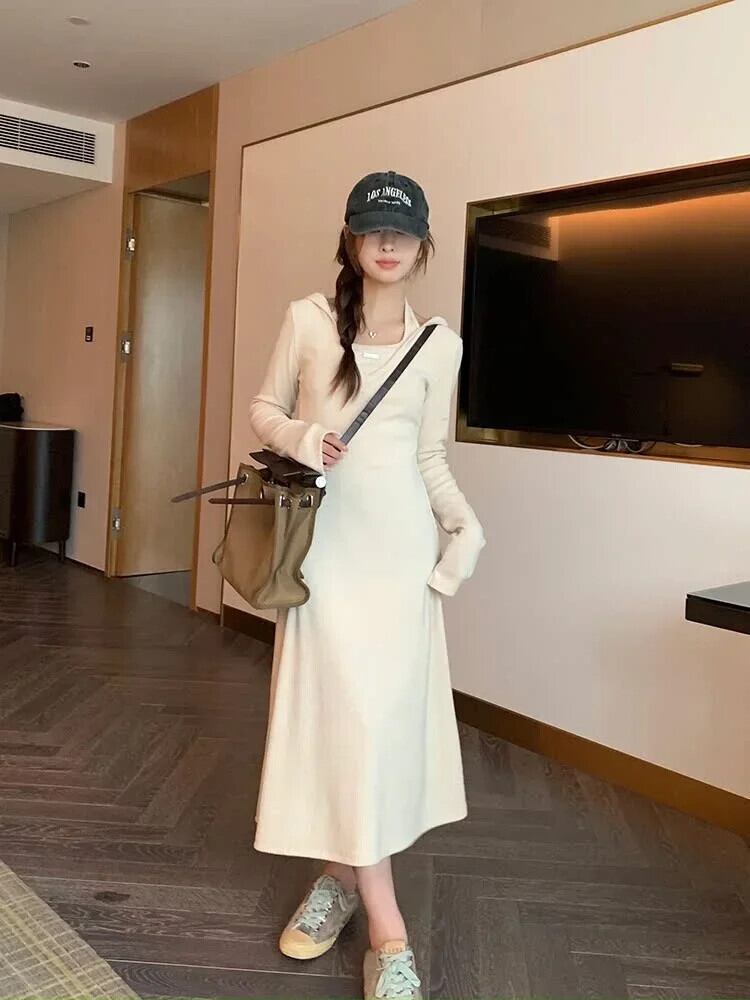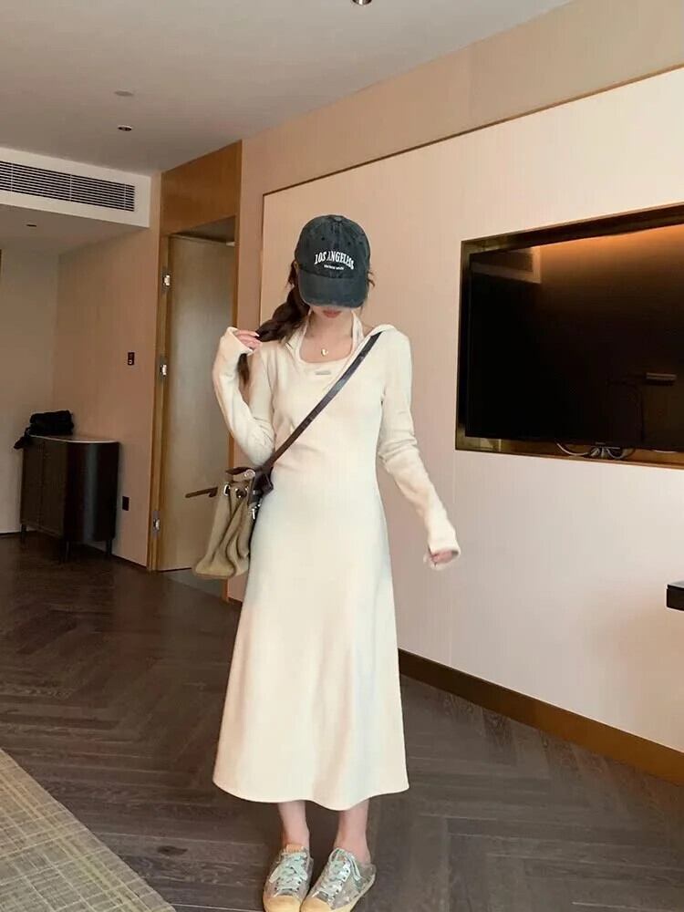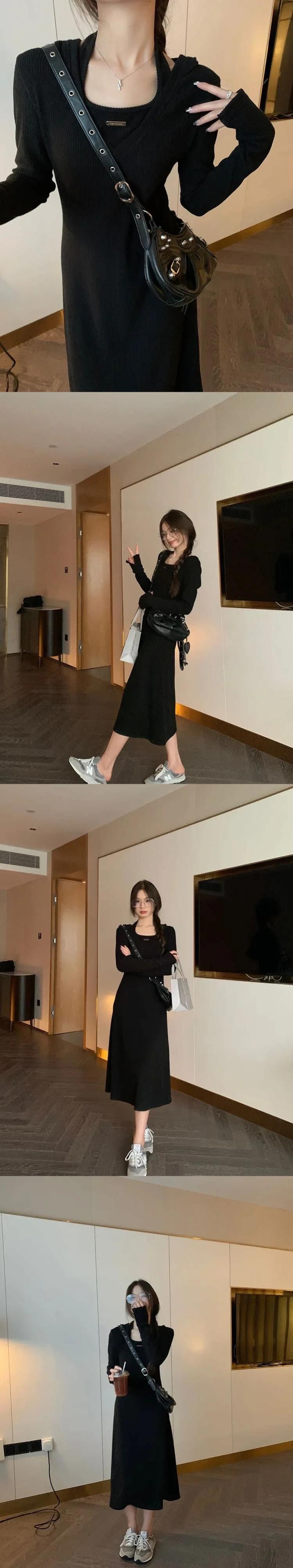韓国 A ラインフリース暖かいドレス秋冬ベルベット厚みドレスニット偽二枚マキシドレス オータム 秋物 ウィンター 冬物 Aライン ソリッドカラー